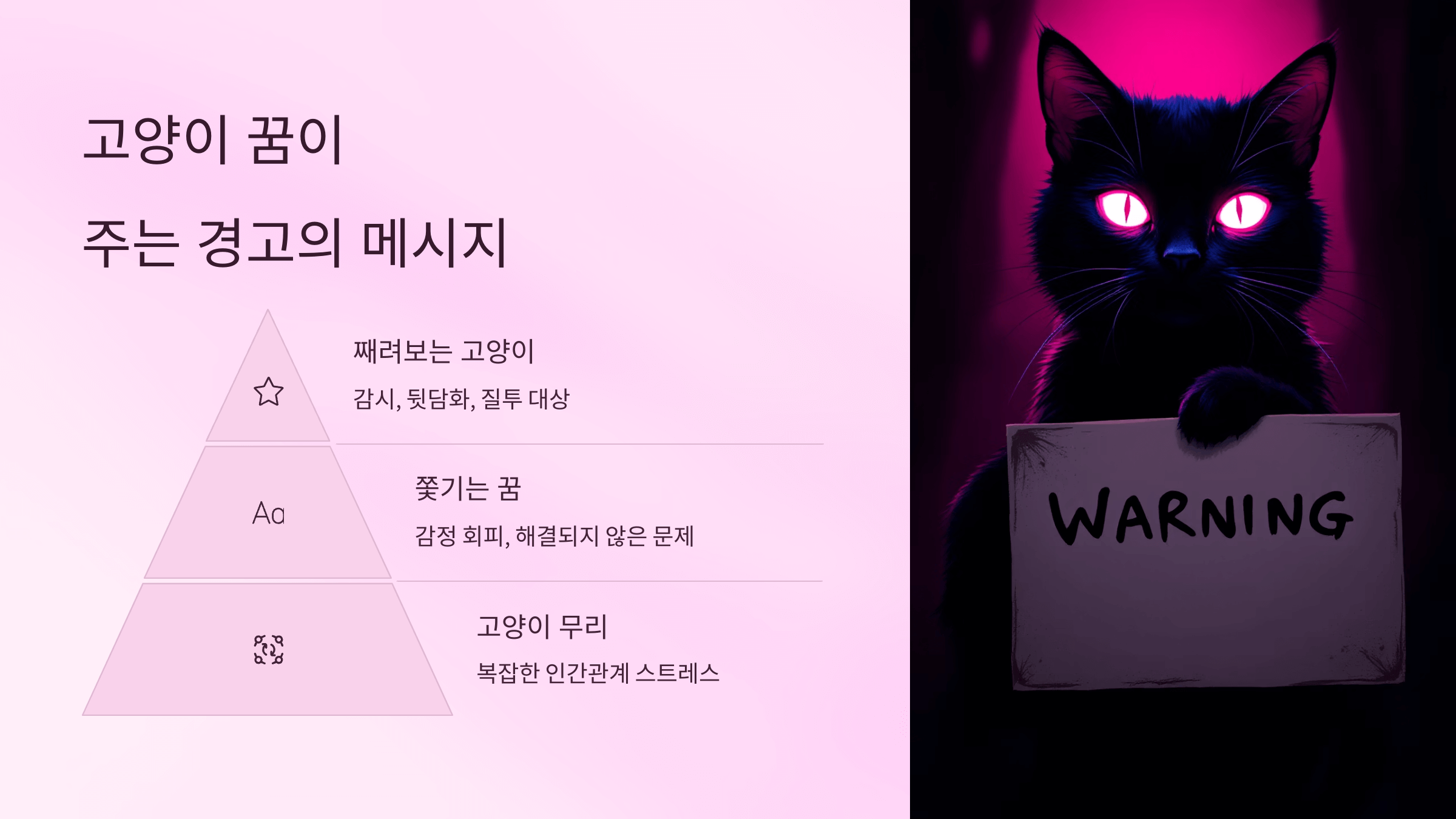 - 고양이가 사람 말을 하는 꿈 → 내면의 목소리, 결정 앞의 직감