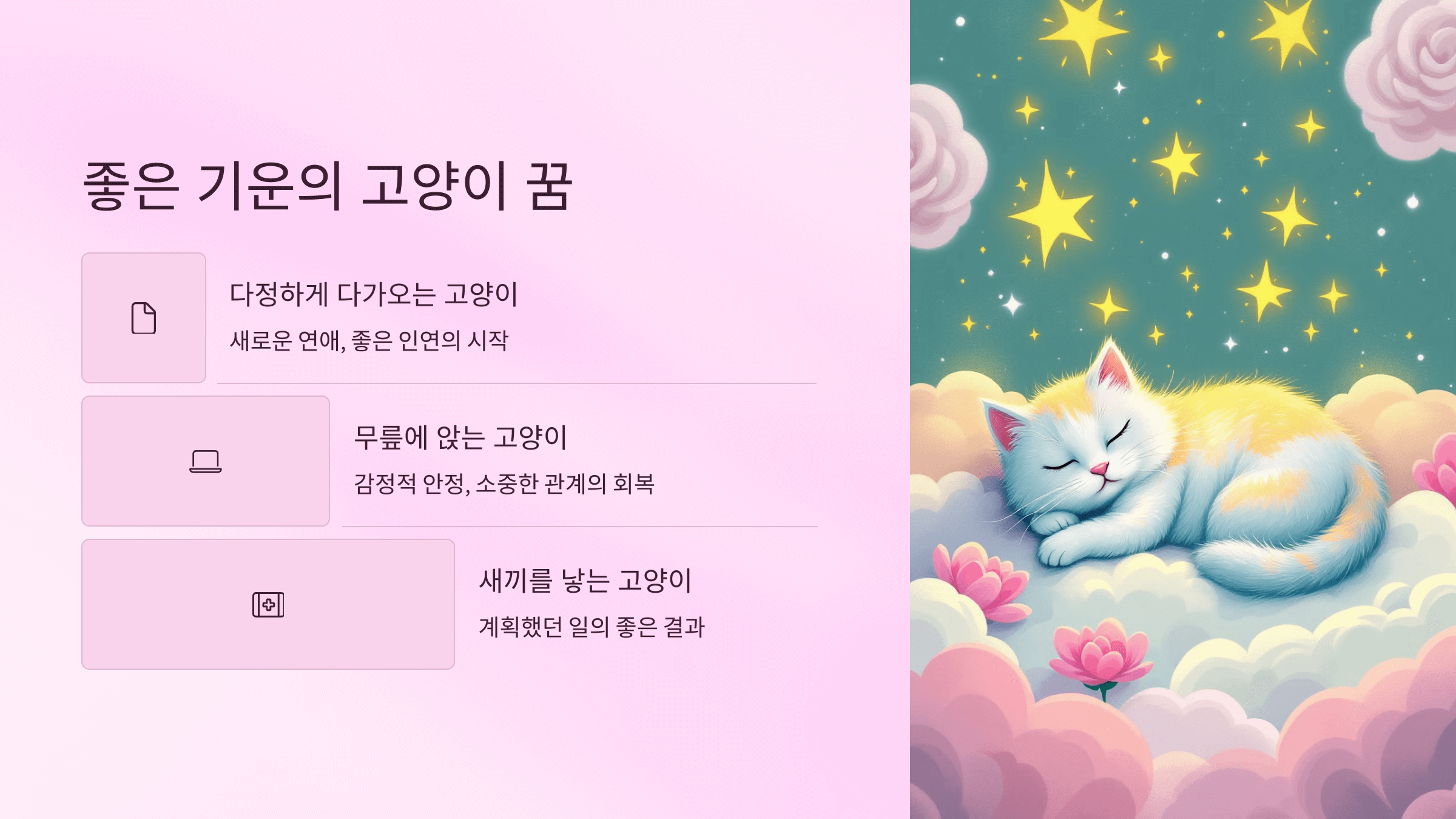 고양이 꿈이라고 무조건 부정적으로 해석할 필요는 없어요. 포인트는 ‘느꼈던 감정’과 ‘꿈 속의 분위기’예요.