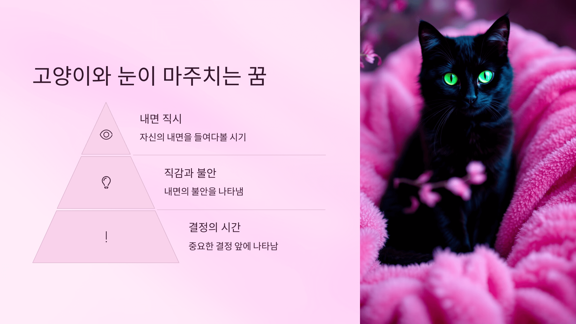 고양이의 눈은 상징적으로 직감과 내면의 불안을 나타내기 때문에, 이 꿈은 결정을 내려야 할 타이밍에 자주 나타나요.