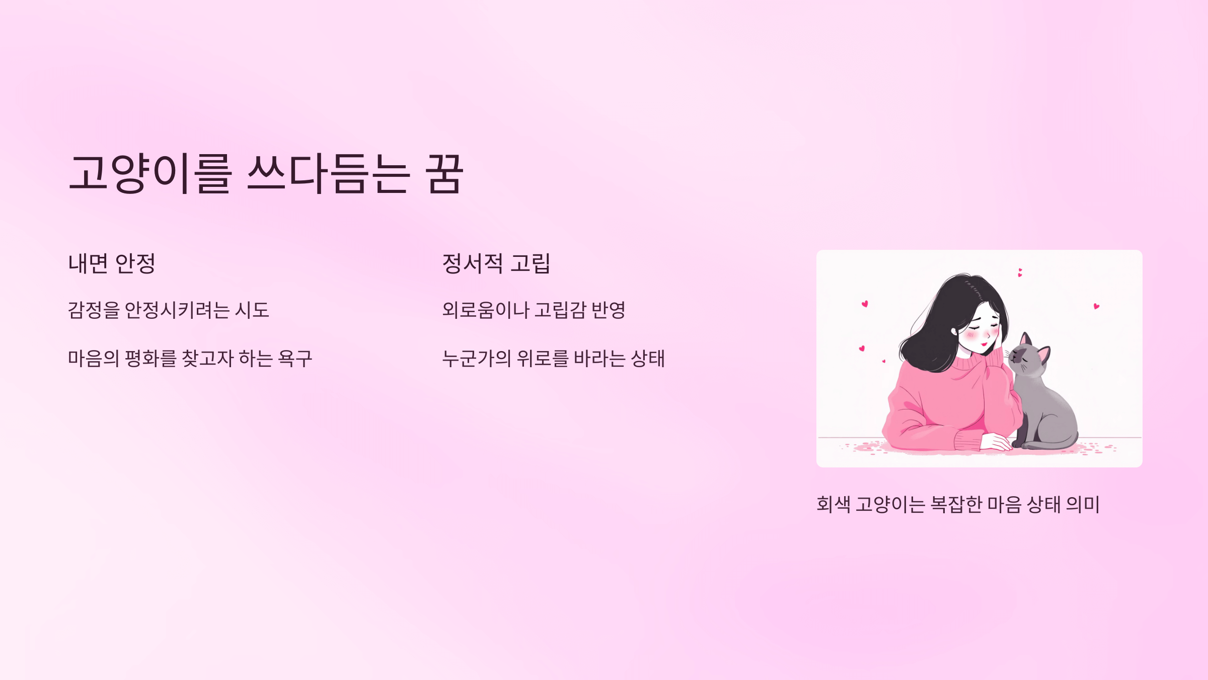 고양이를 쓰다듬는 꿈은 당신 내면의 감정을 안정시키려는 시도로 해석됩니다.