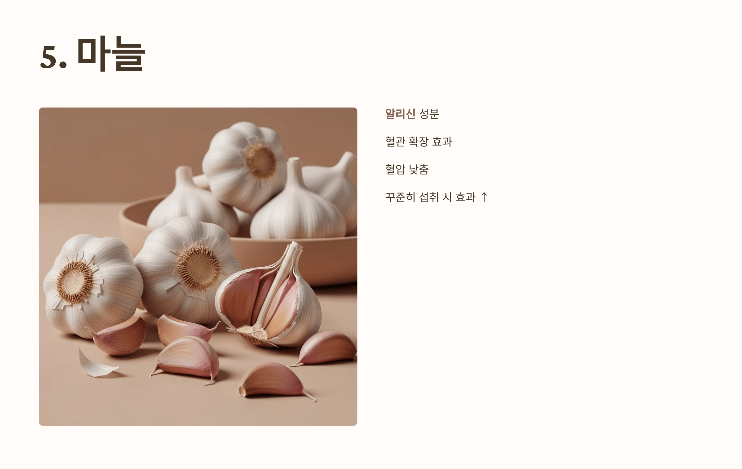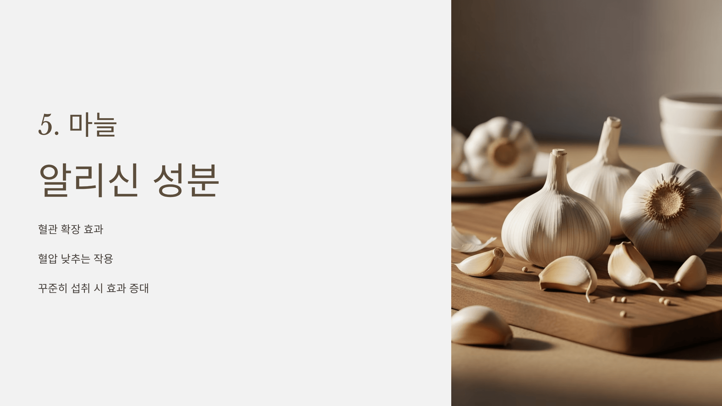 알리신 성분이 혈관을 확장해 혈압을 낮춰줍니다. 꾸준히 먹으면 효과가 커요.