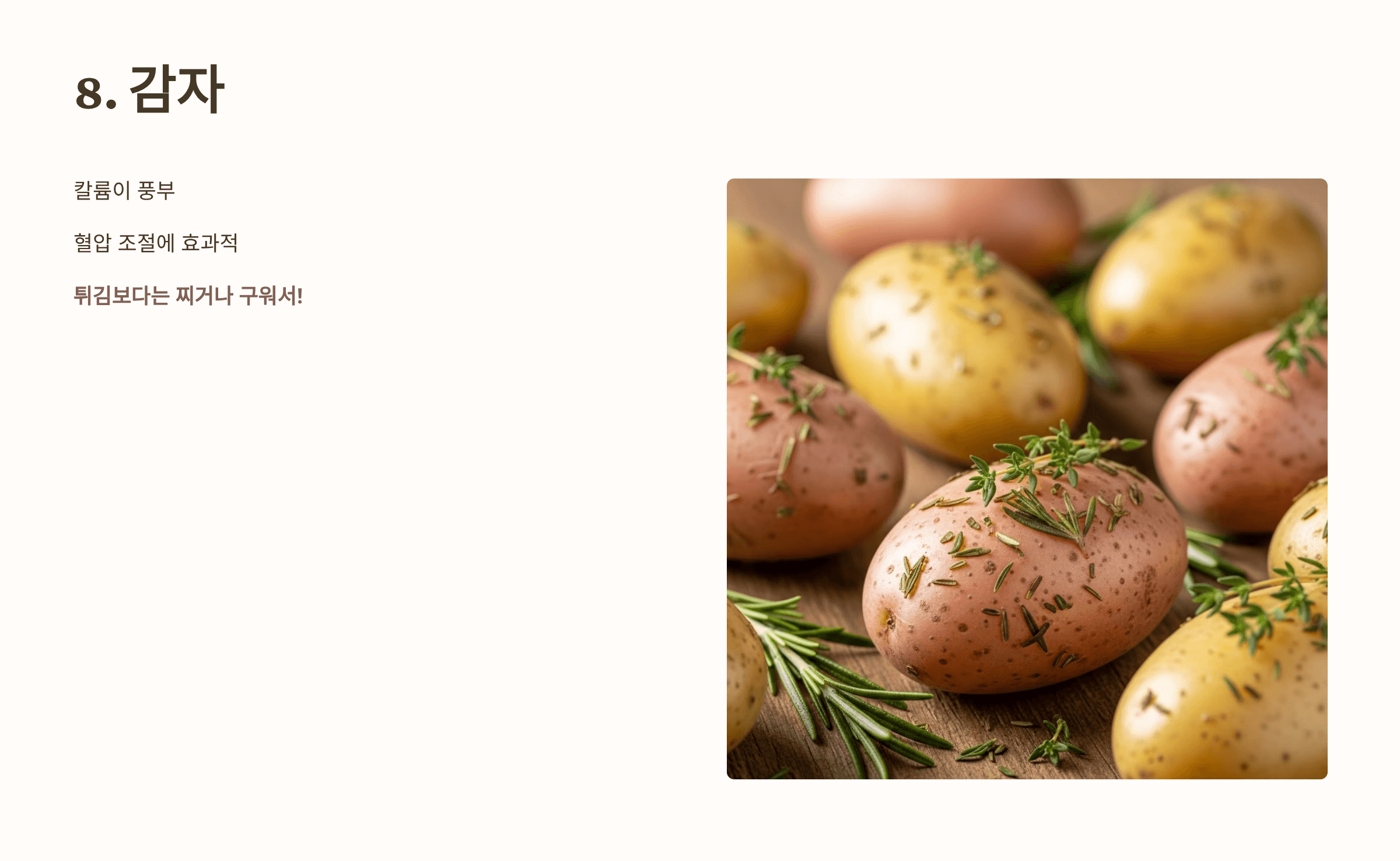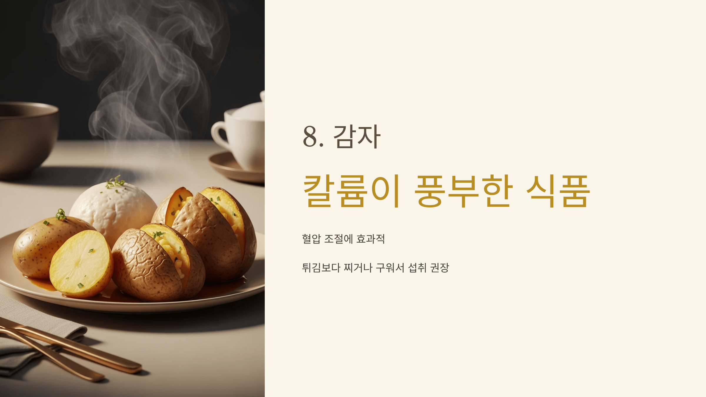 칼륨이 풍부한 감자는 혈압 조절에 좋아요. 다만 튀김보다는 찌거나 구워서 드시는 게 좋습니다.