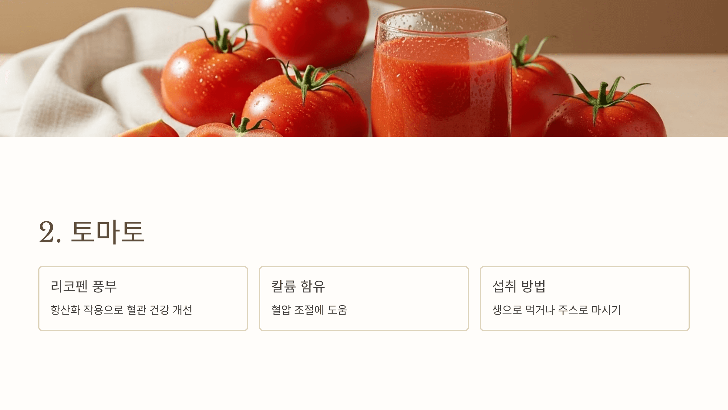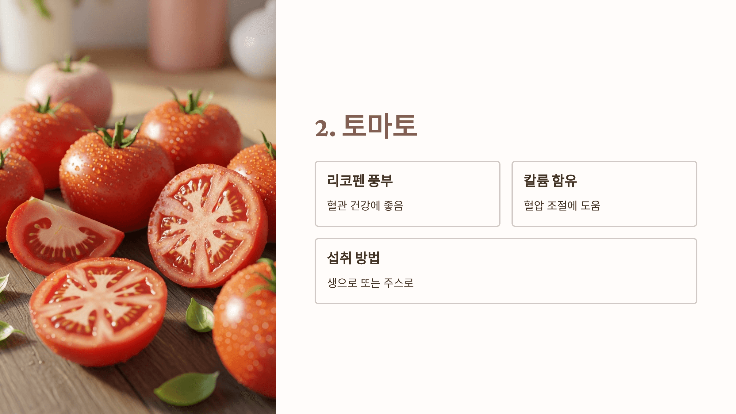 리코펜과 칼륨이 풍부해 혈관 건강에 좋아요. 생으로 먹거나 토마토 주스로 마셔도 훌륭합니다.