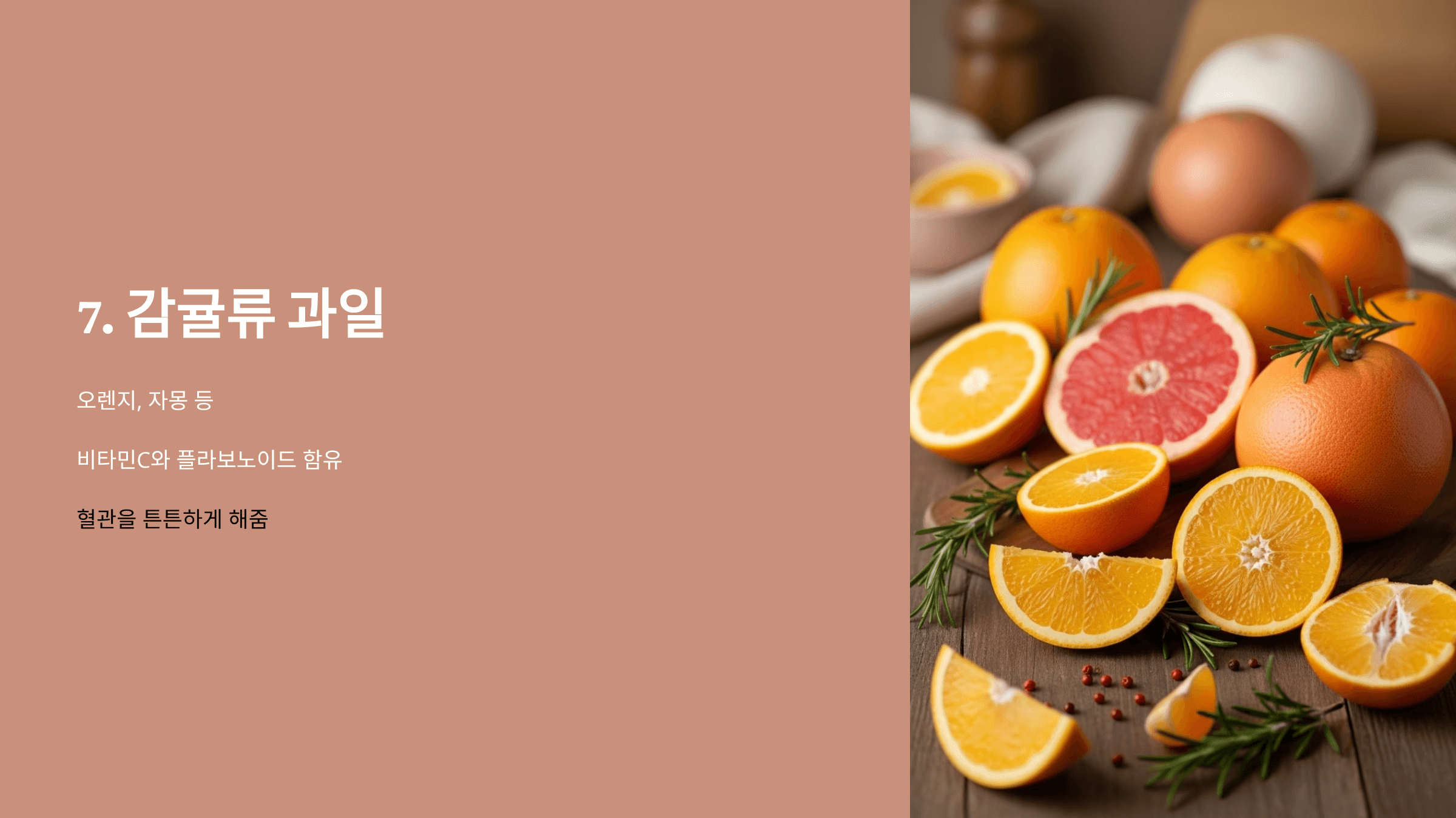오렌지, 자몽 같은 과일은 비타민C와 플라보노이드가 혈관을 튼튼하게 해줍니다.