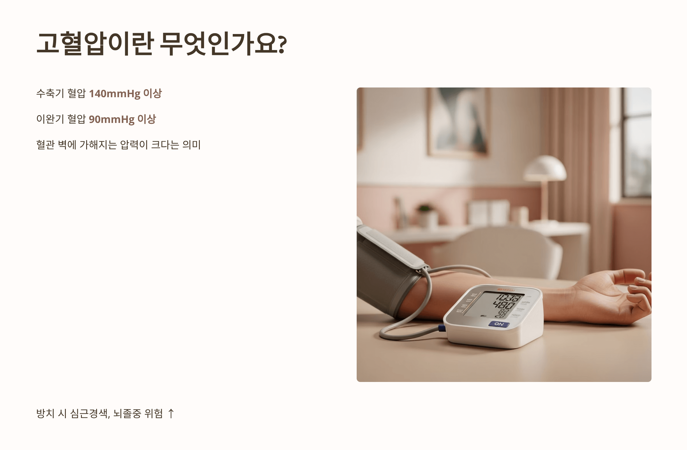 혈압이 높다는 건 그만큼 혈관 벽에 가해지는 압력이 크다는 뜻이고, 장기간 방치하면 심근경색, 뇌졸중 같은 심혈관 질환으로 이어질 수 있어요.