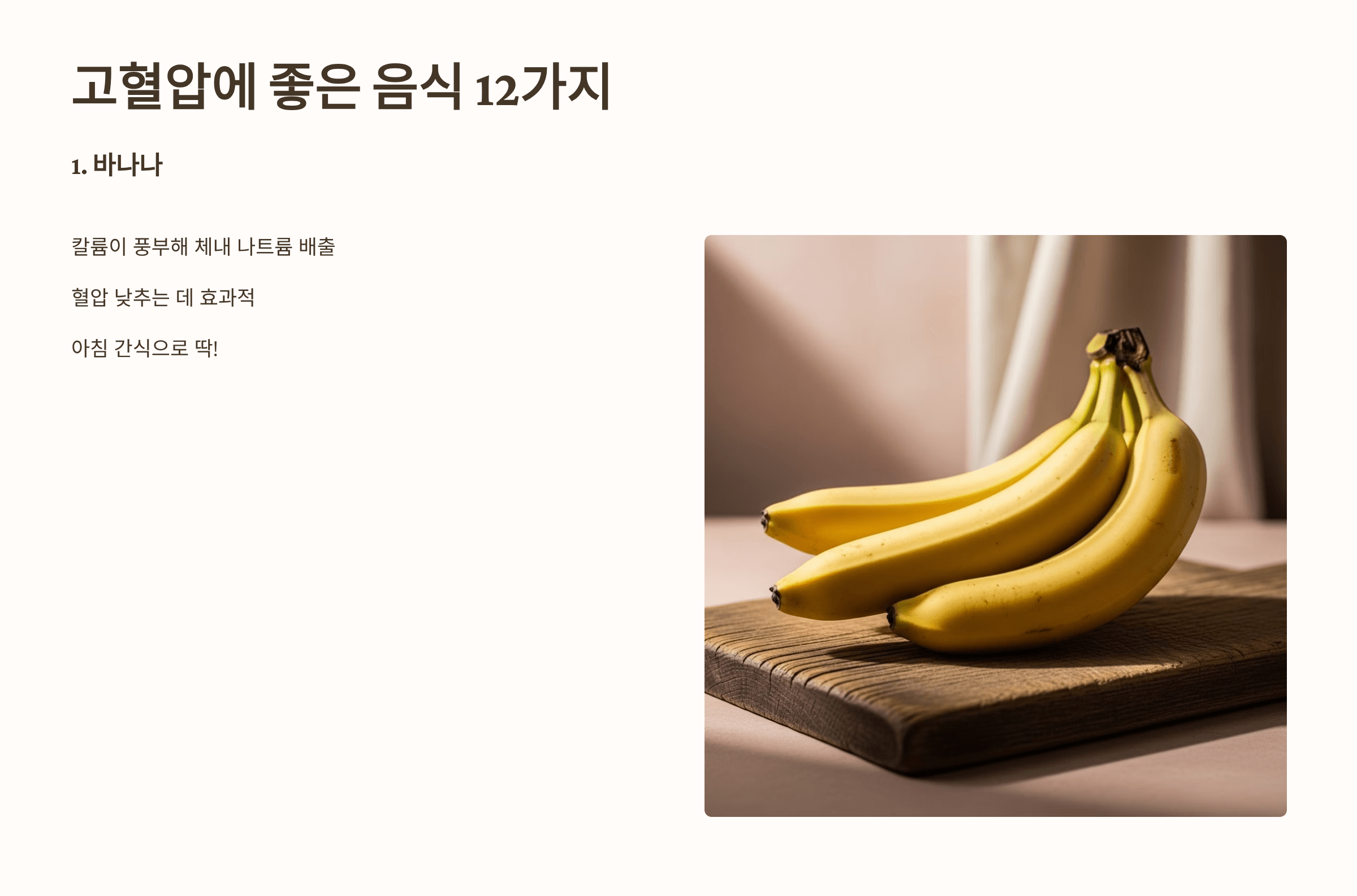 칼륨이 풍부해 체내 나트륨을 배출하고 혈압을 낮추는 데 효과적입니다. 아침 간식으로 딱이에요.
