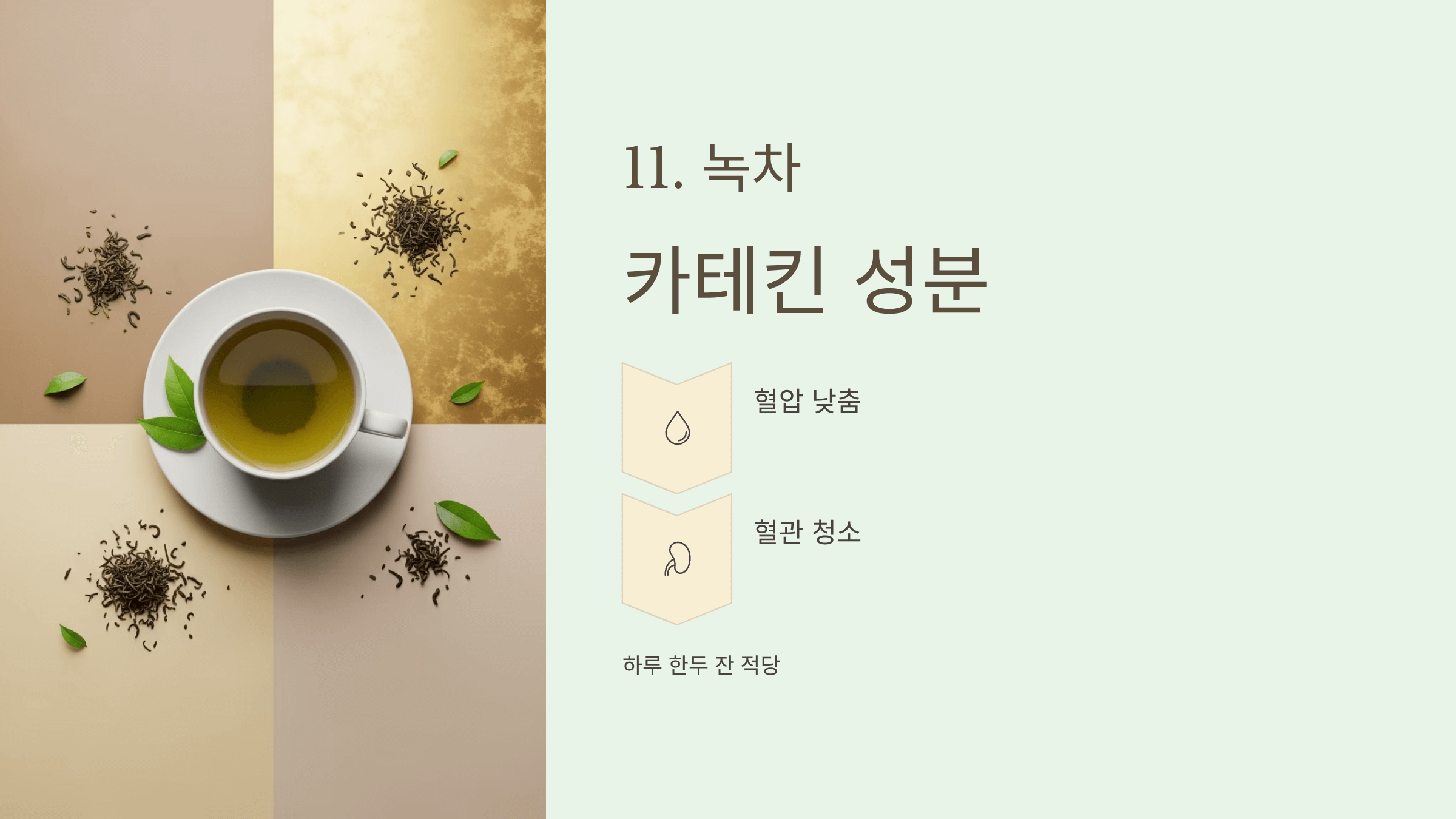 카테킨 성분이 혈압을 낮추고 혈관을 깨끗하게 해줍니다. 하루 한두 잔이 적당합니다.