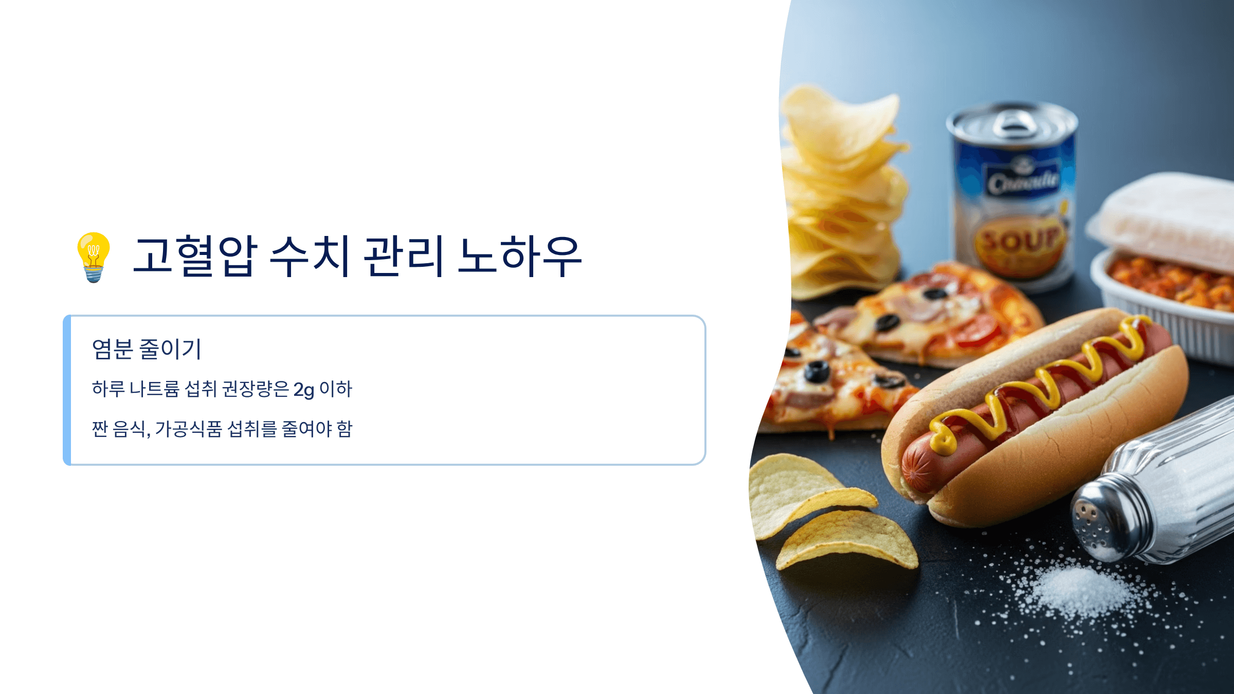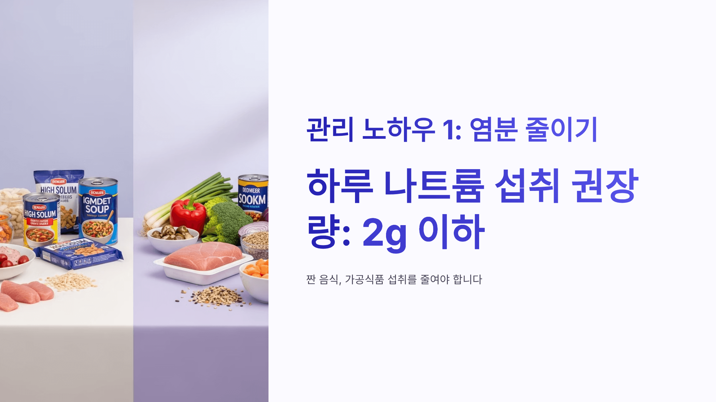 하루 나트륨 섭취 권장량은 2g 이하입니다. 짠 음식, 가공식품 섭취를 줄여야 합니다. - 규칙적인 운동하기