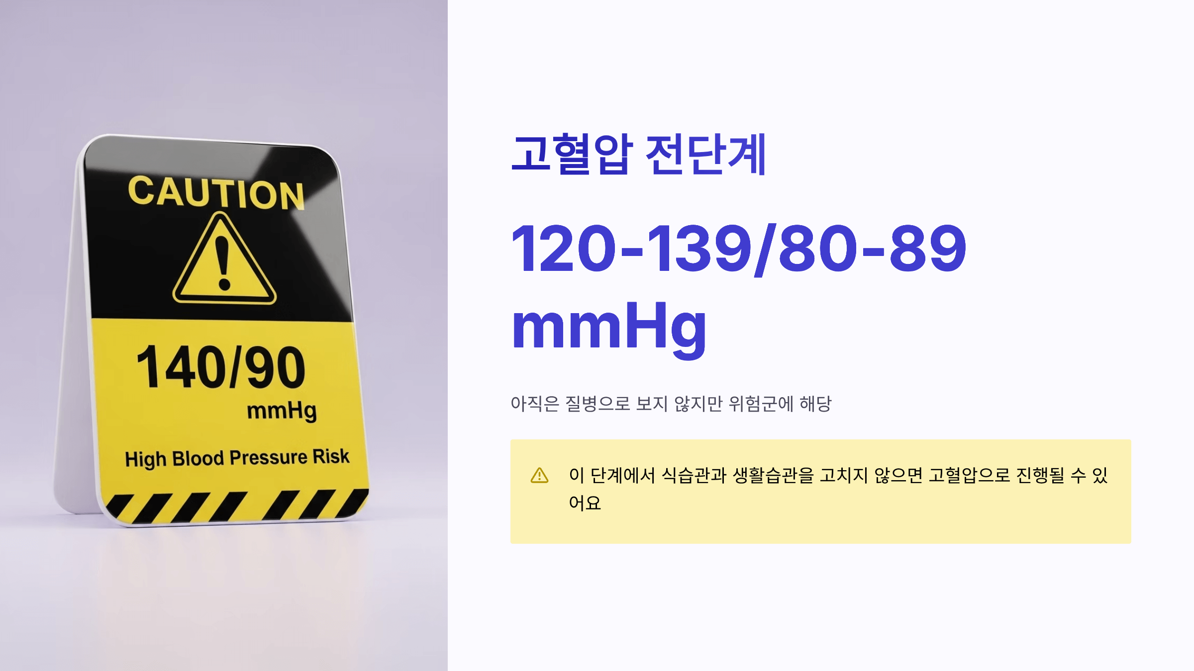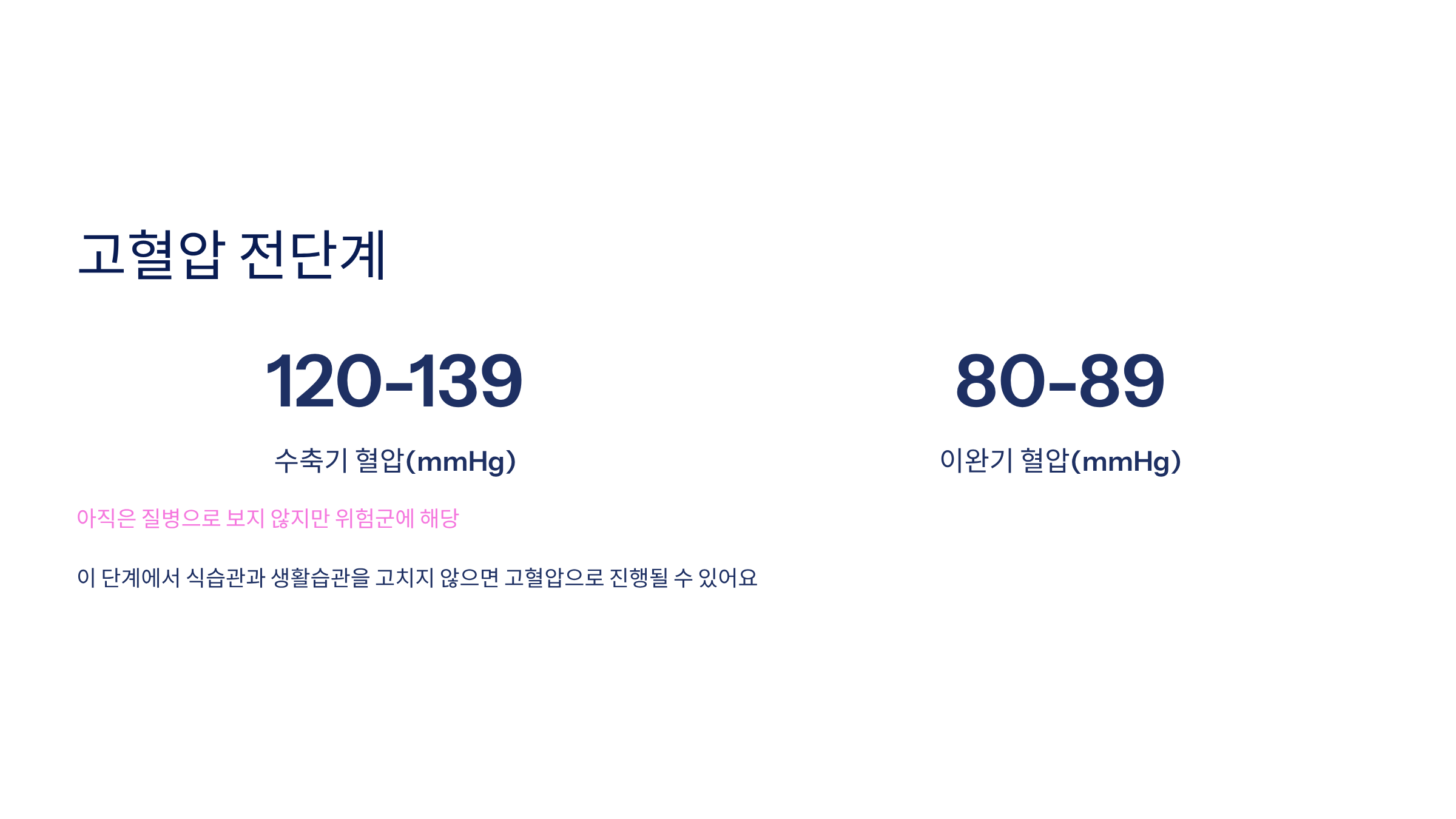 - 이 단계에서 식습관과 생활습관을 고치지 않으면 고혈압으로 진행될 수 있어요.