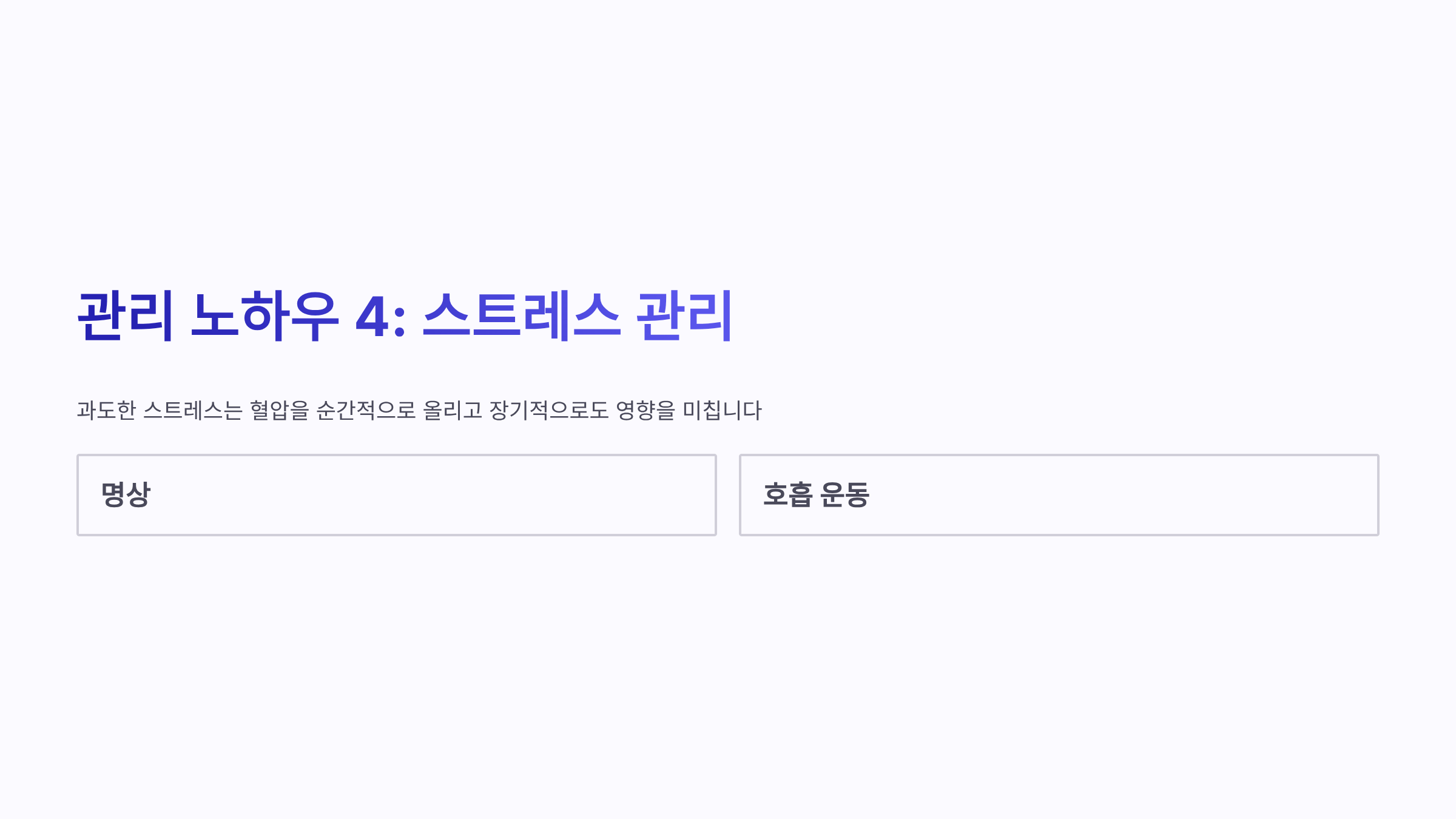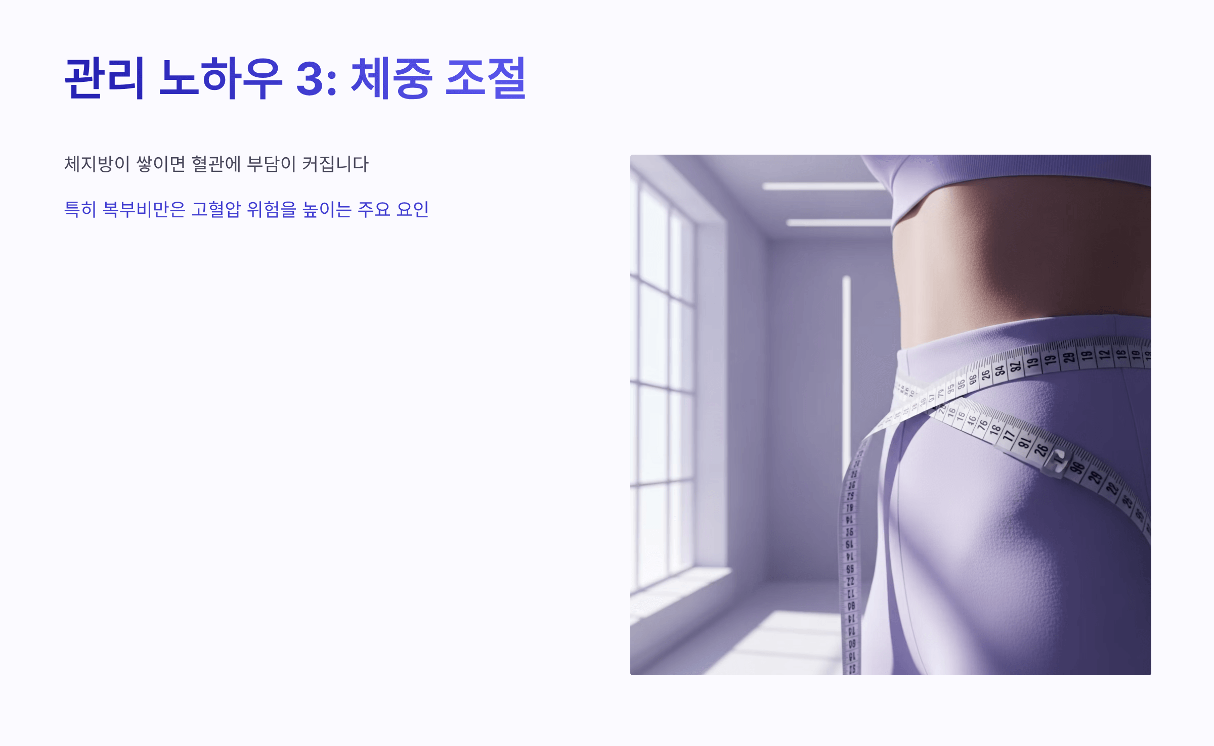 체지방이 쌓이면 혈관에 부담이 커집니다. 특히 복부비만은 고혈압 위험을 높이는 주요 요인입니다. - 스트레스 관리하기