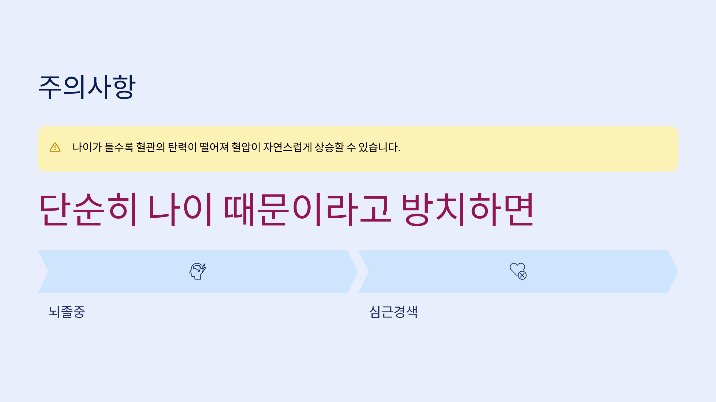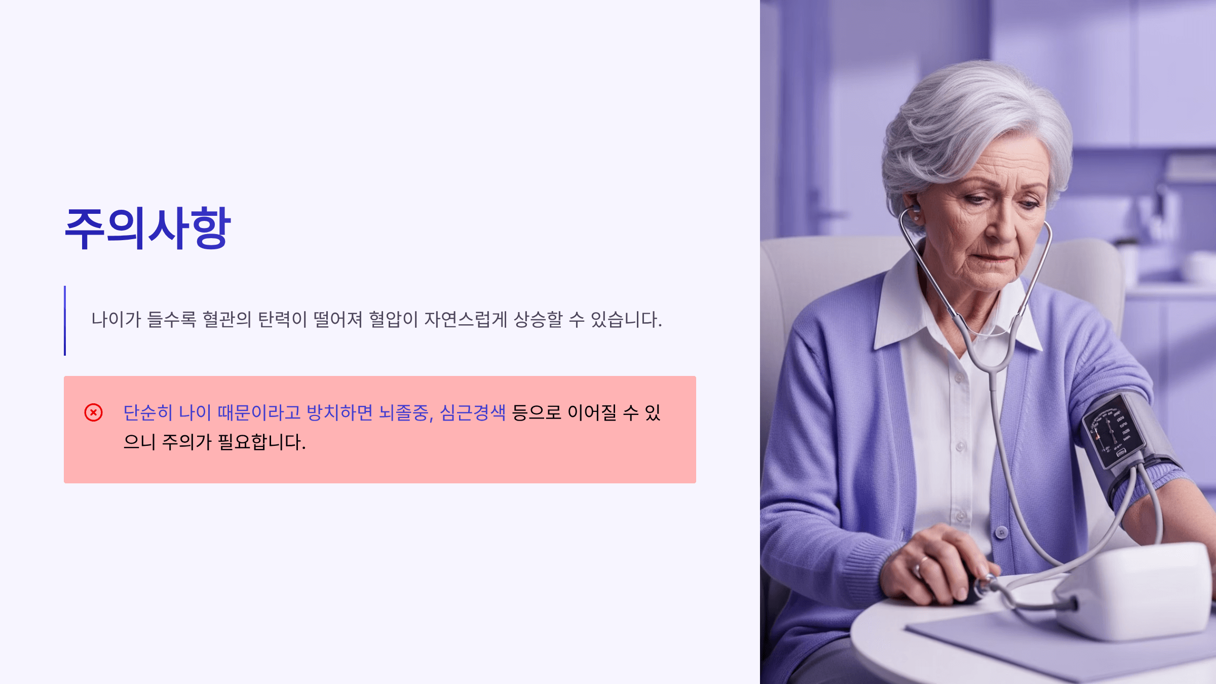 📌 참고: 나이가 들수록 혈관의 탄력이 떨어져 혈압이 자연스럽게 상승할 수 있습니다. 하지만 단순히 나이 때문이라고 방치하면 뇌졸중, 심근경색 등으로 이어질 수 있으니 주의가 필요합니다.