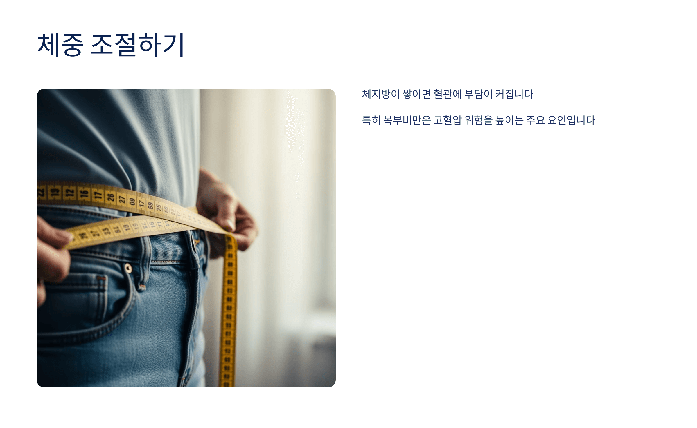 빠르게 걷기, 자전거 타기, 수영 등 유산소 운동은 혈관 건강을 지켜줍니다. 주 3~4회, 30분 이상 실천해보세요. - 체중 조절하기