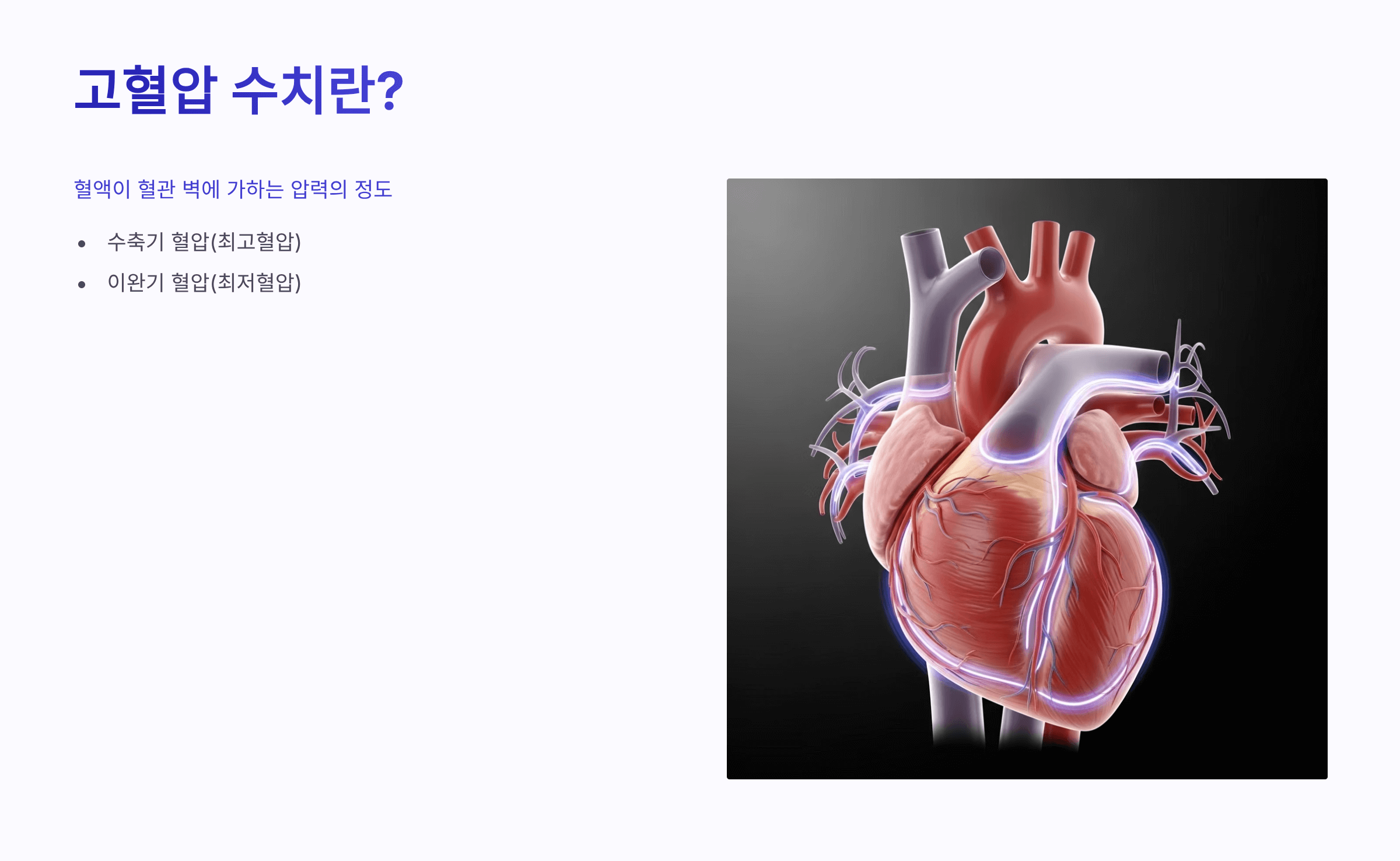 - 수축기 혈압(최고혈압): 심장이 수축해서 혈액을 내보낼 때의 압력