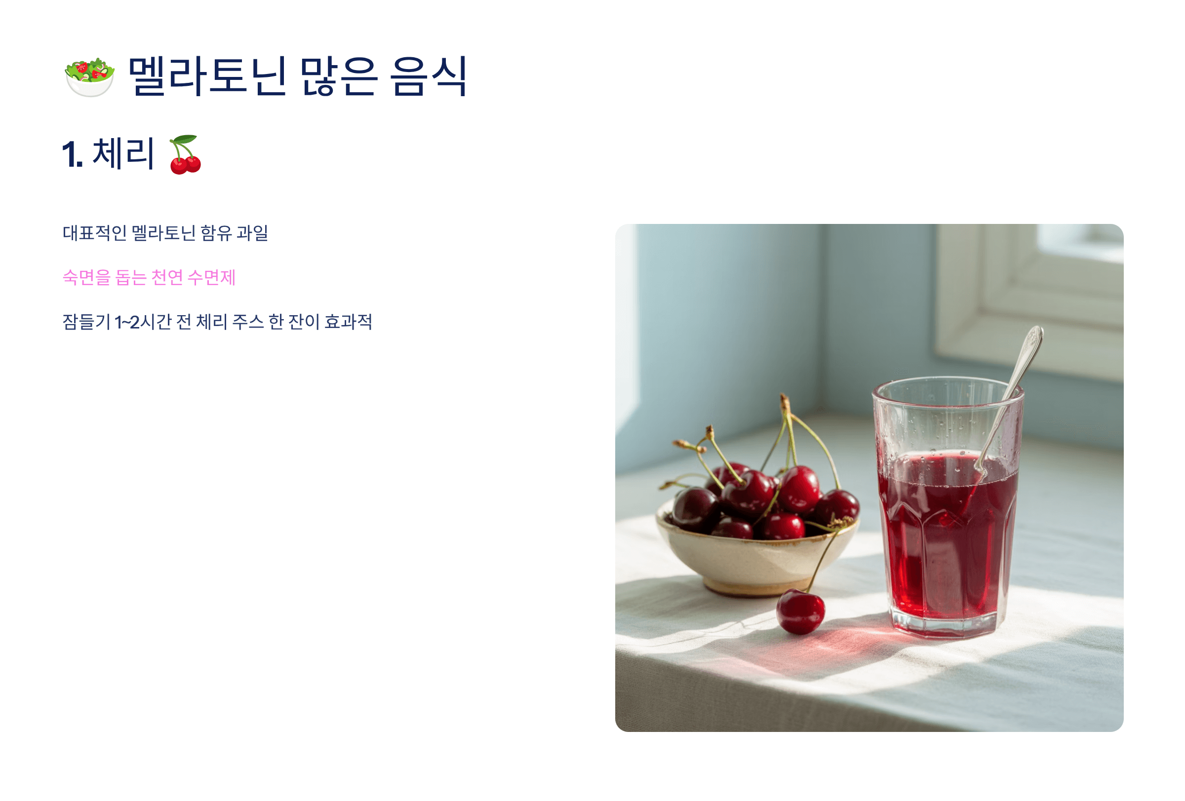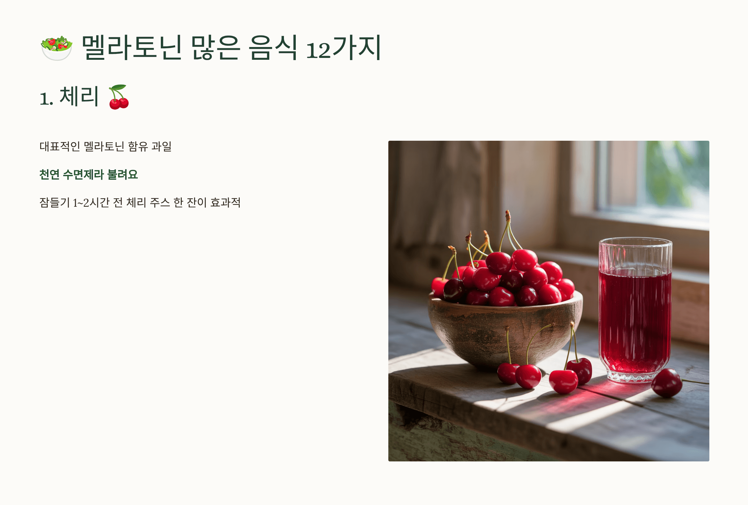 체리는 대표적인 멜라토닌 함유 과일로, 숙면을 돕는 천연 수면제라 불려요.