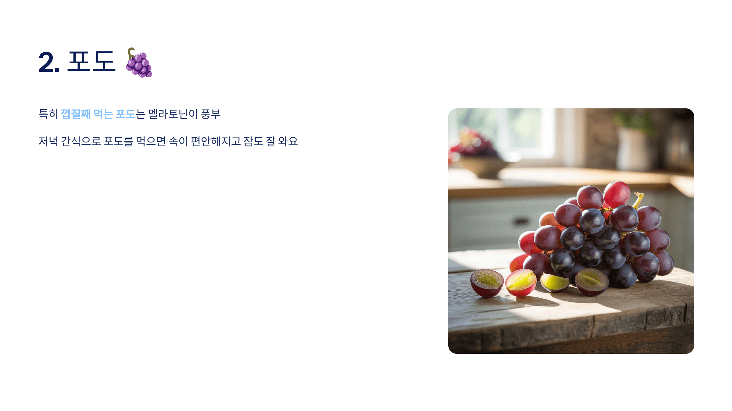 저는 저녁 간식으로 포도를 먹는데, 속이 편안해지고 잠도 잘 와요.