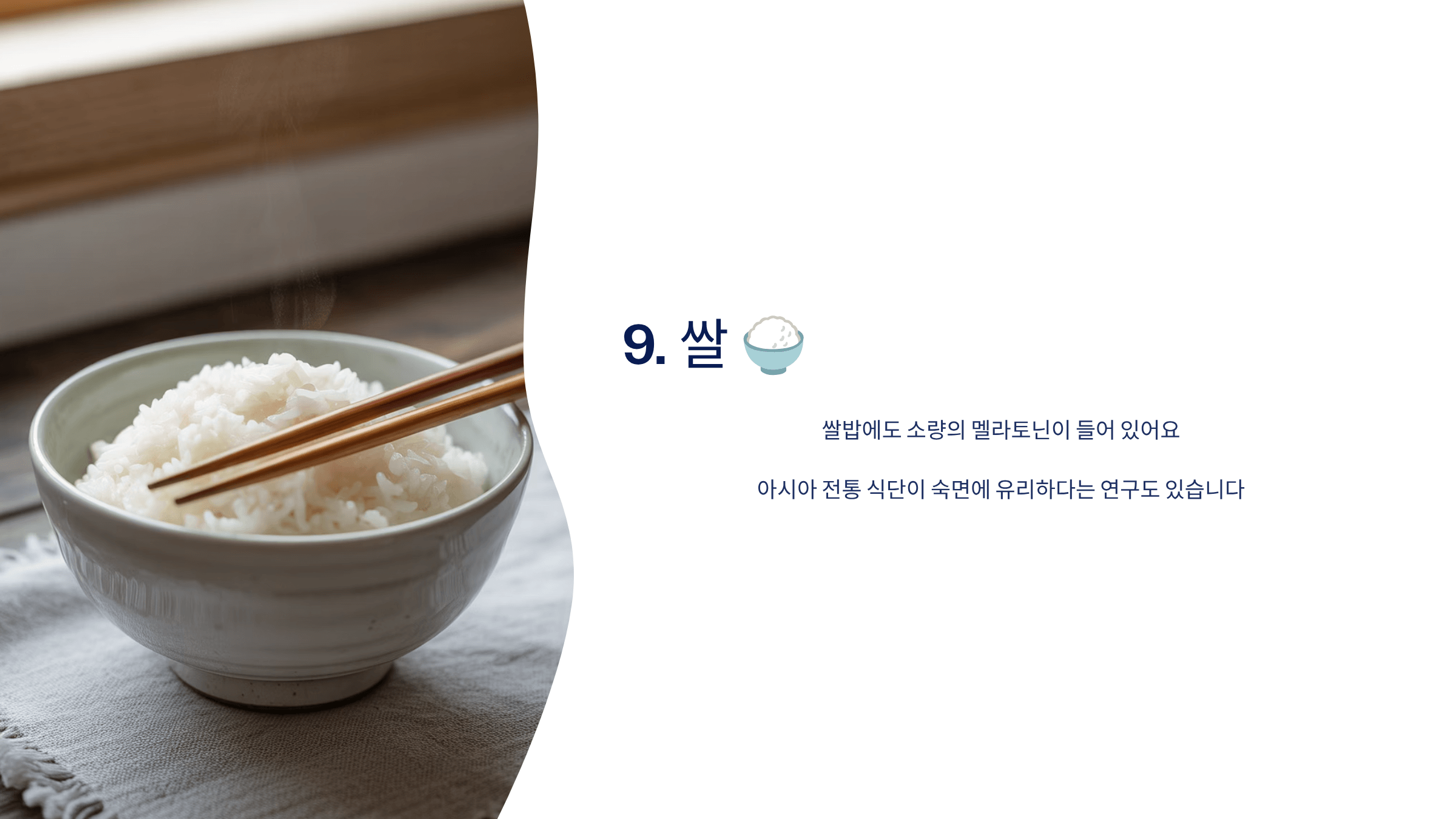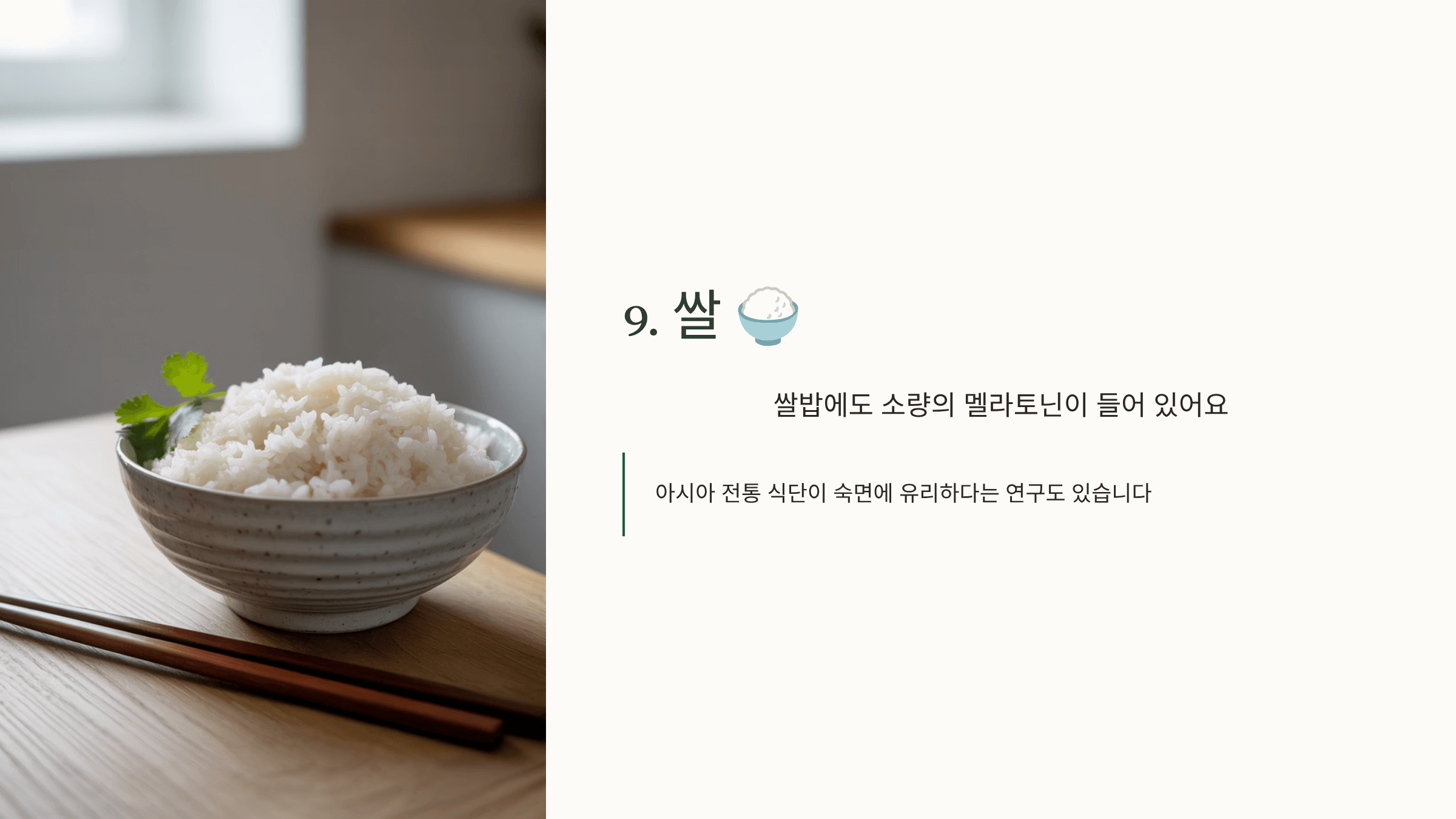 쌀밥에도 소량의 멜라토닌이 들어 있어, 아시아 전통 식단이 숙면에 유리하다는 연구도 있습니다.