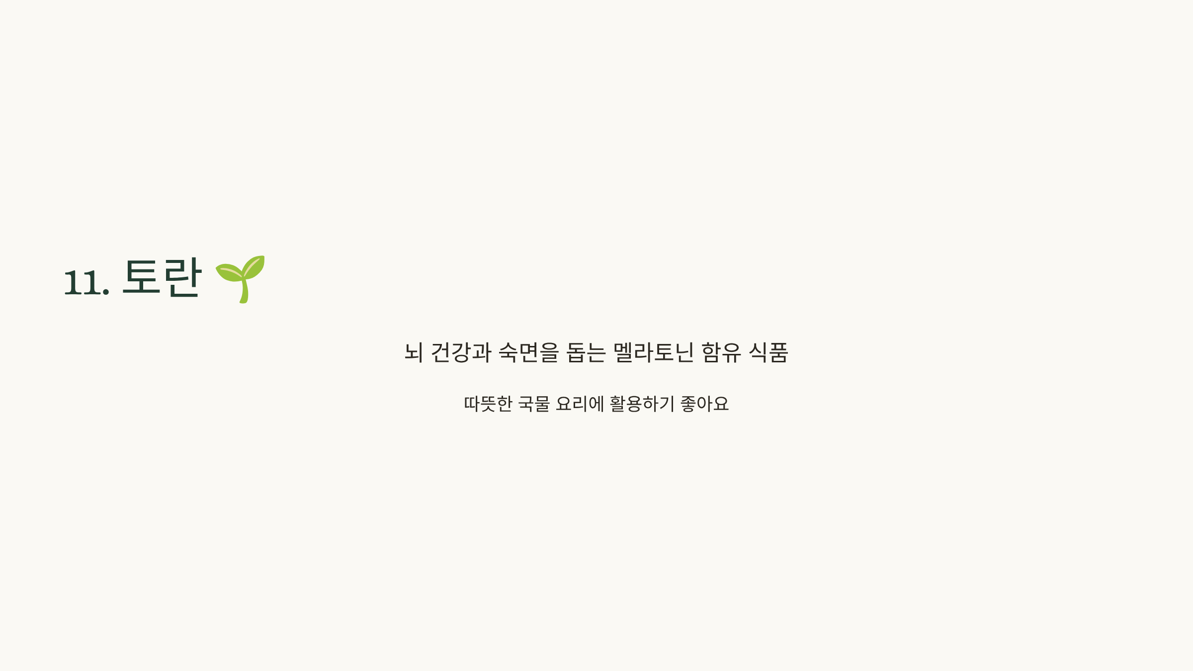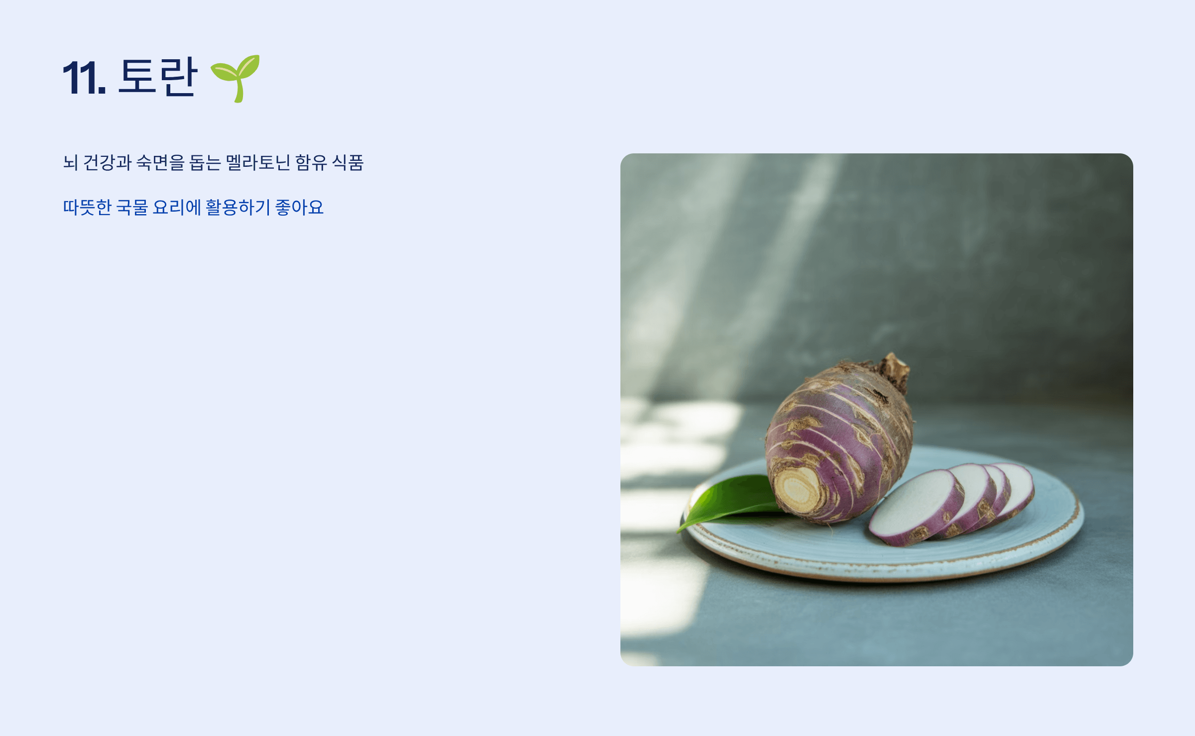토란은 뇌 건강과 숙면을 돕는 멜라토닌 함유 식품으로, 따뜻한 국물 요리에 활용하기 좋아요.