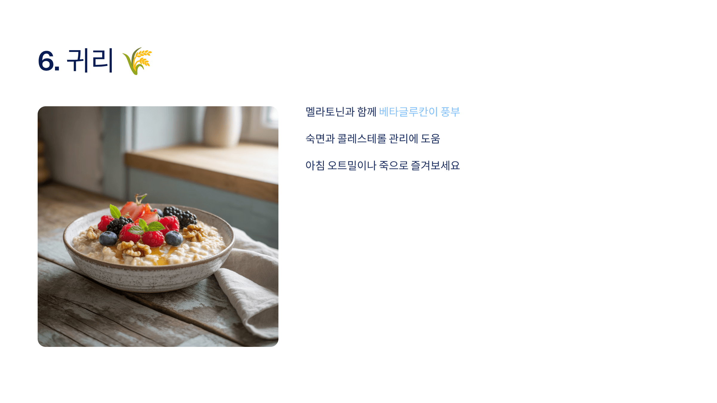 귀리는 멜라토닌과 함께 베타글루칸이 풍부해 숙면과 콜레스테롤 관리에도 도움을 줍니다.