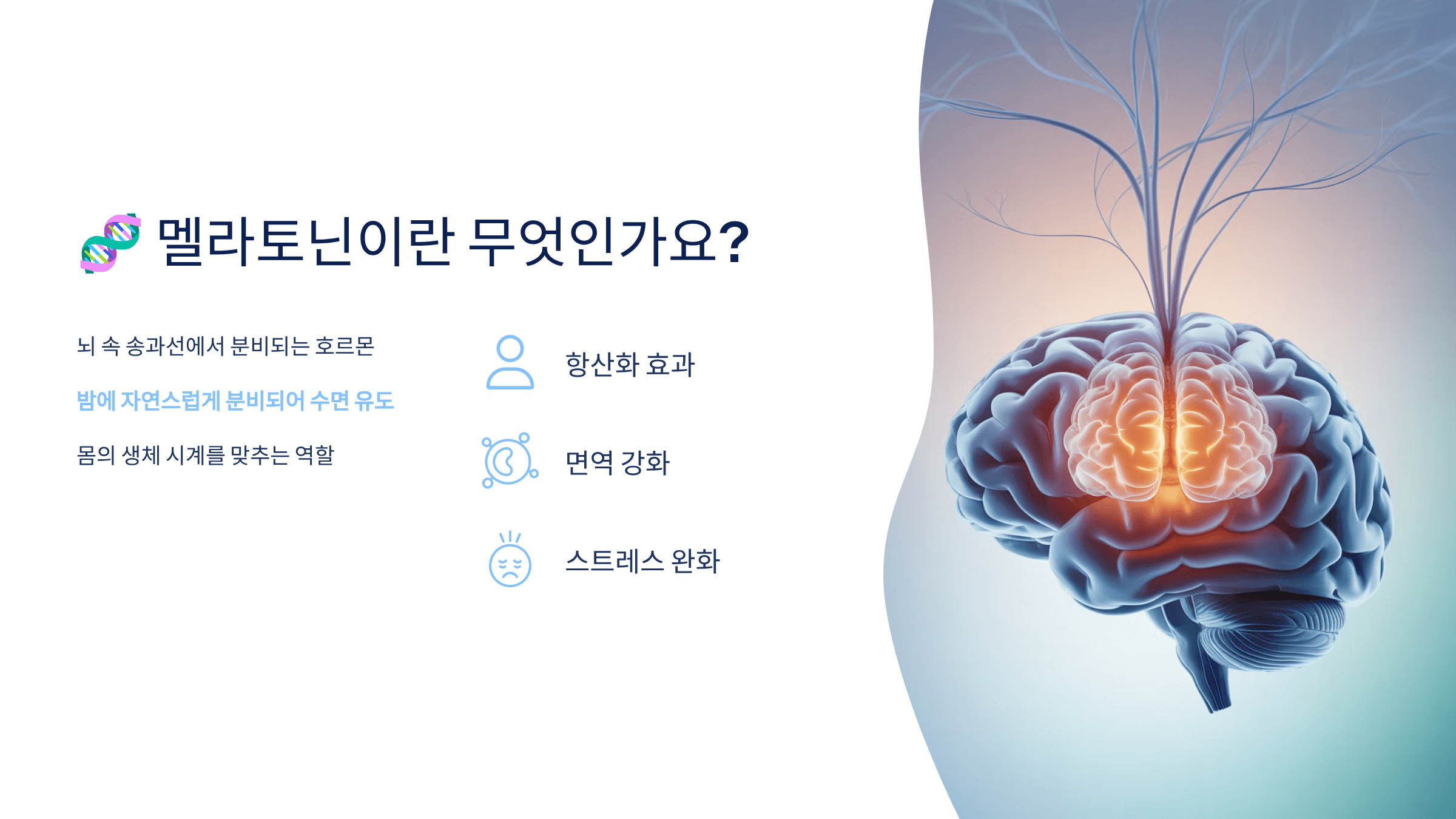 멜라토닌은 단순한 수면 호르몬이 아니라, 우리 몸의 생체 리듬과 면역, 노화 방지에도 중요한 역할을 해요.