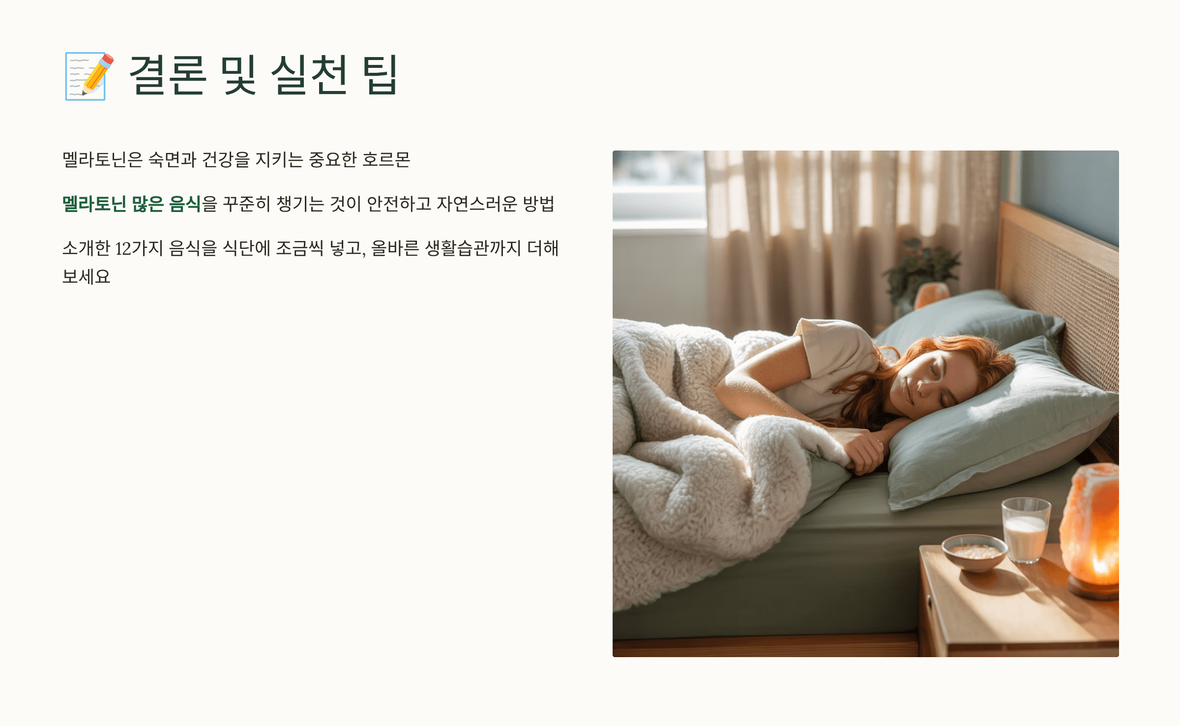 오늘은 멜라토닌이 풍부한 음식 12가지와 함께, 숙면에 도움이 되는 생활 습관까지 정리해드릴게요.
