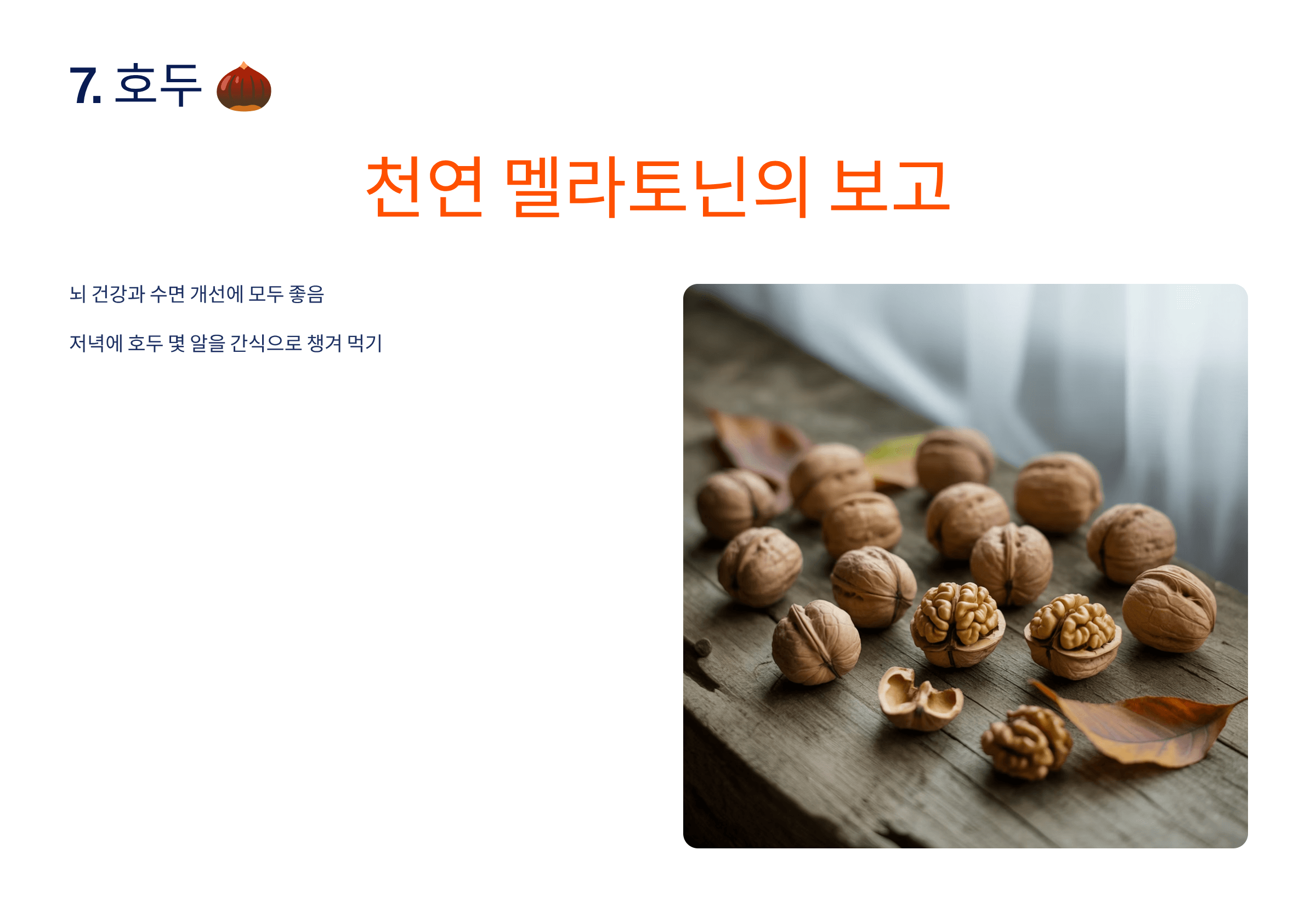 호두는 천연 멜라토닌의 보고라 불리며, 뇌 건강과 수면 개선에 모두 좋습니다.
