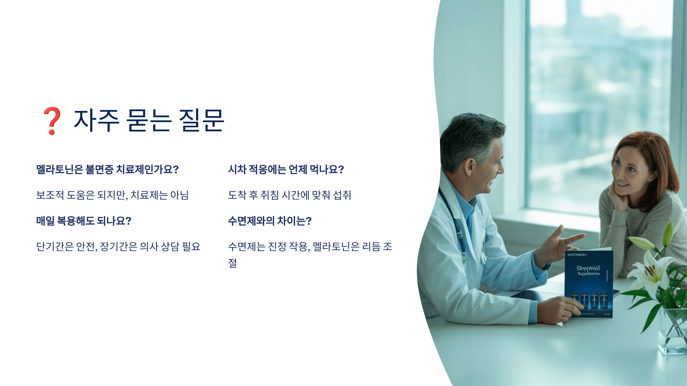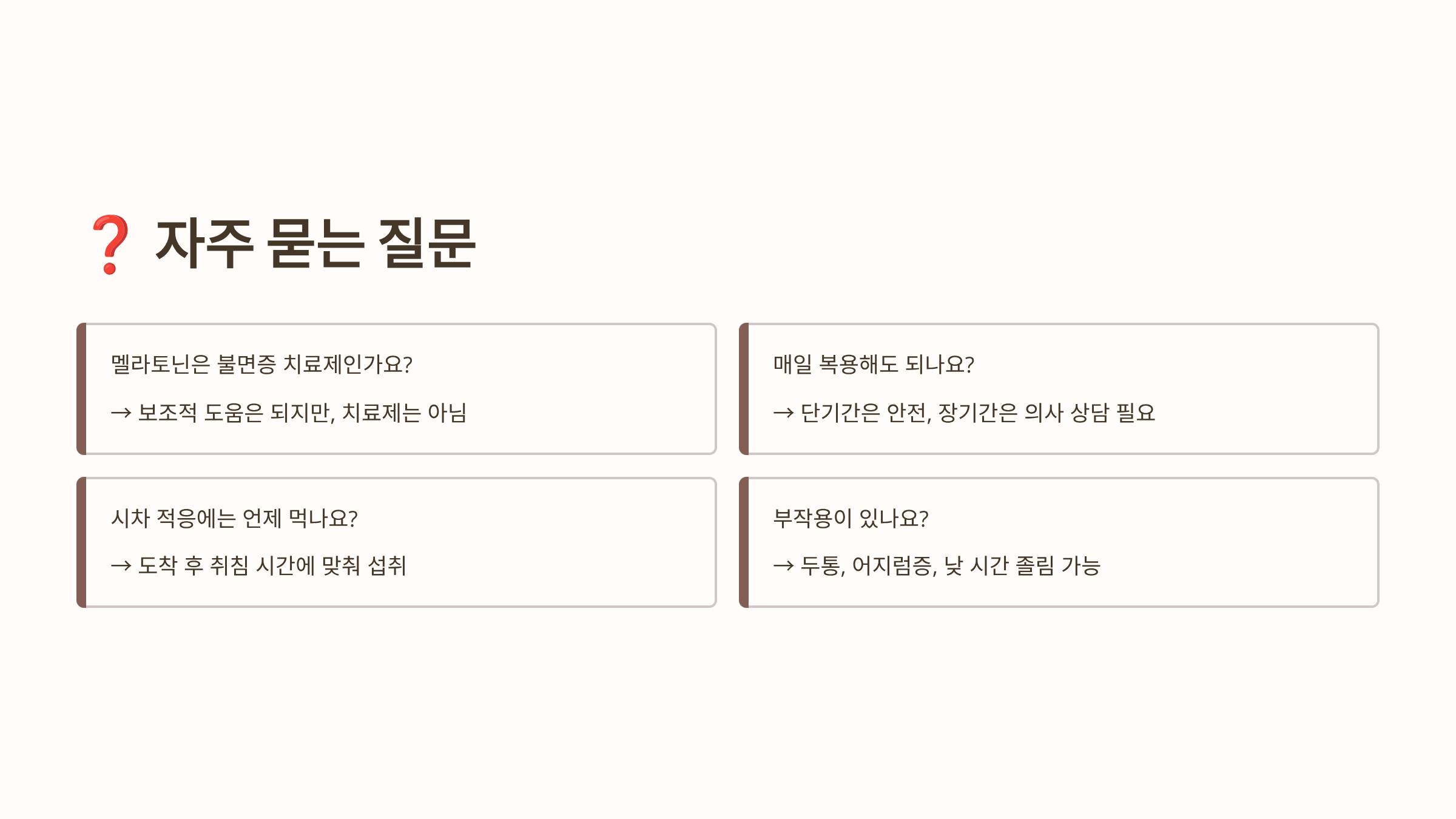 → 두통, 어지럼증, 낮 시간 졸림이 생길 수 있습니다. - 수면제와 멜라토닌의 차이는 무엇인가요?