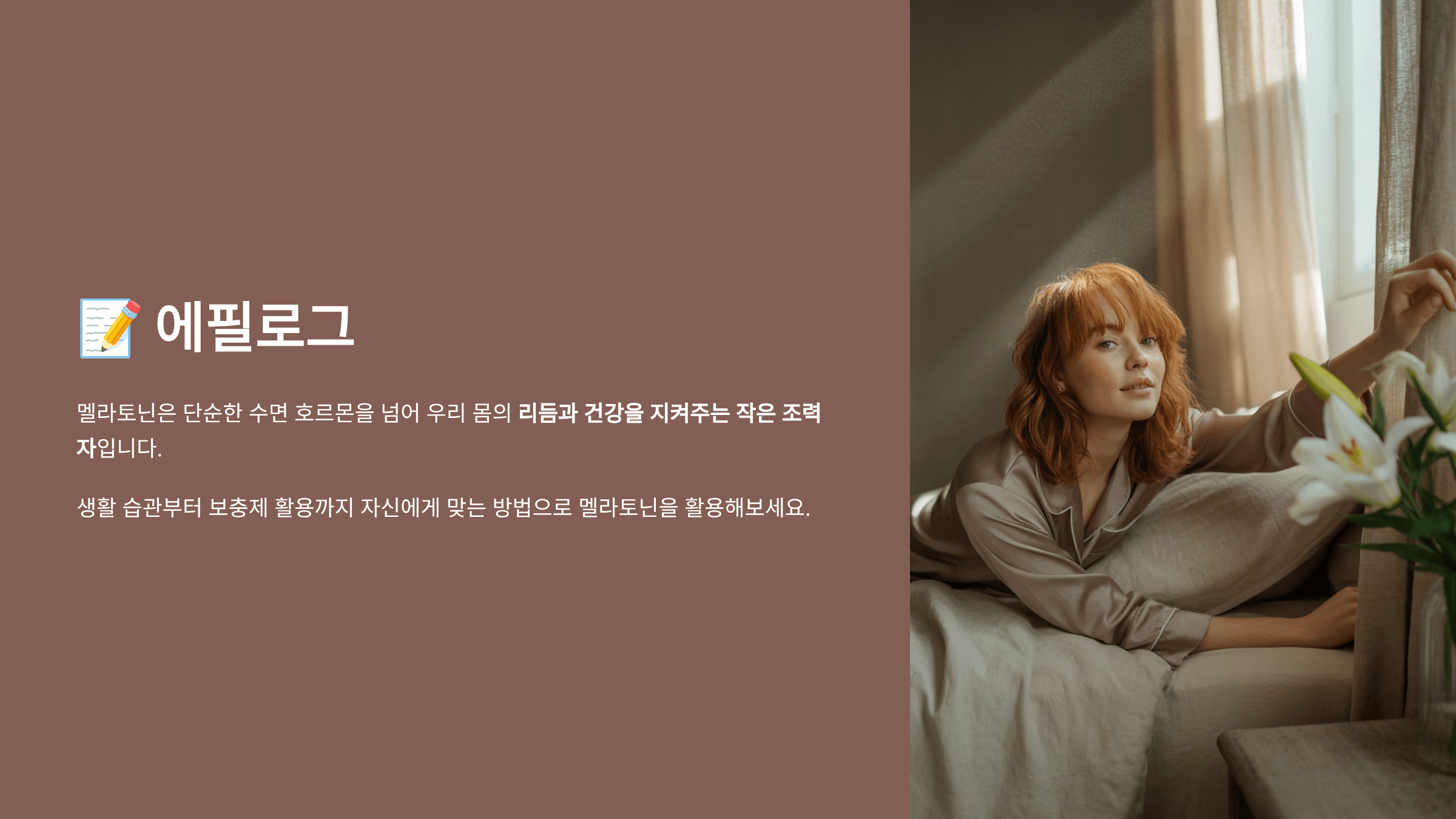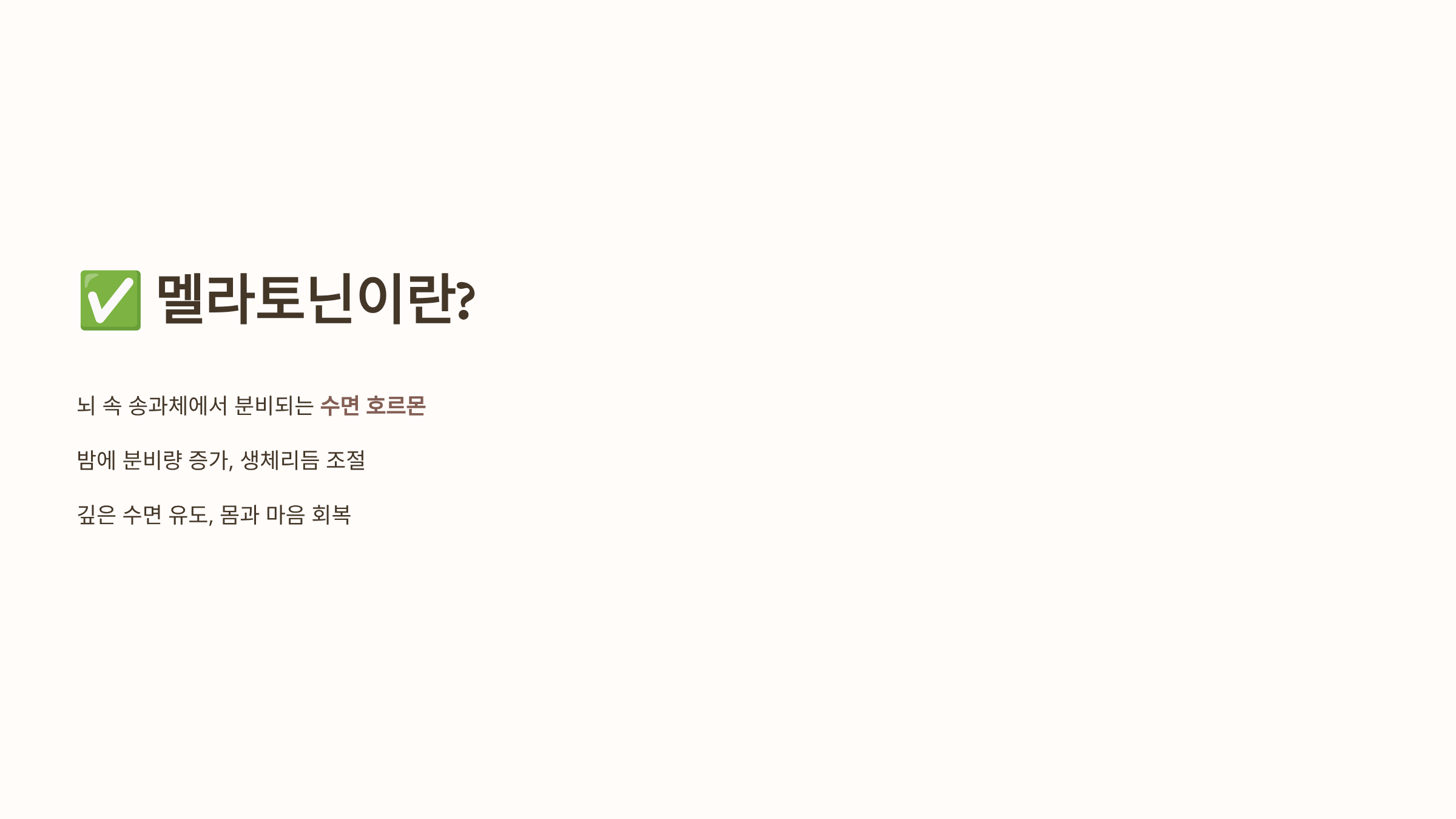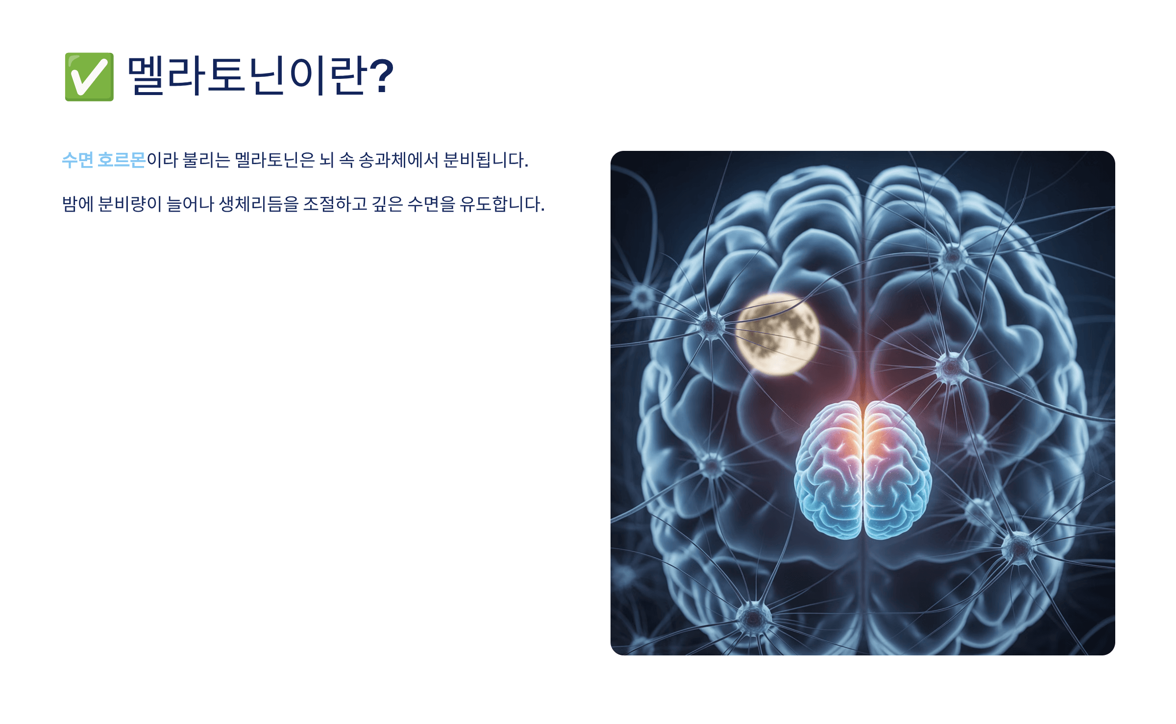 멜라토닌은 ‘수면 호르몬’으로 불리며, 밤이 되면 자연스럽게 분비돼 깊은 숙면을 유도합니다.
