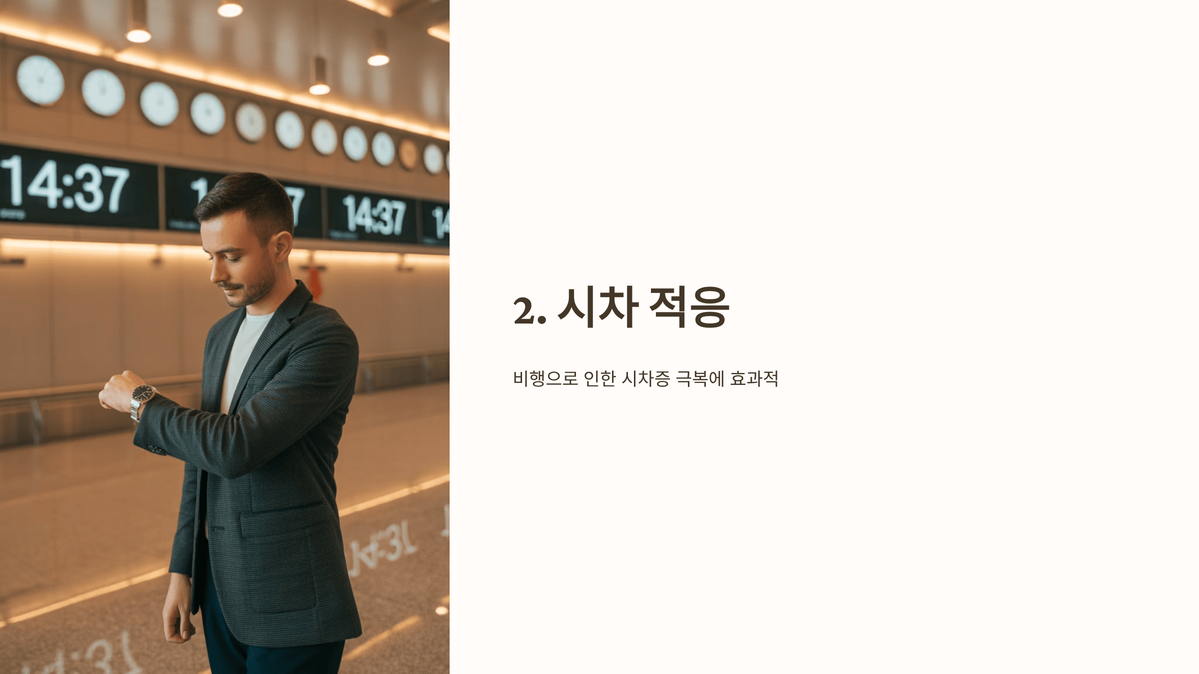 비행기를 자주 타는 분들이 멜라토닌을 활용하는 이유가 바로 시차 적응 때문이에요.