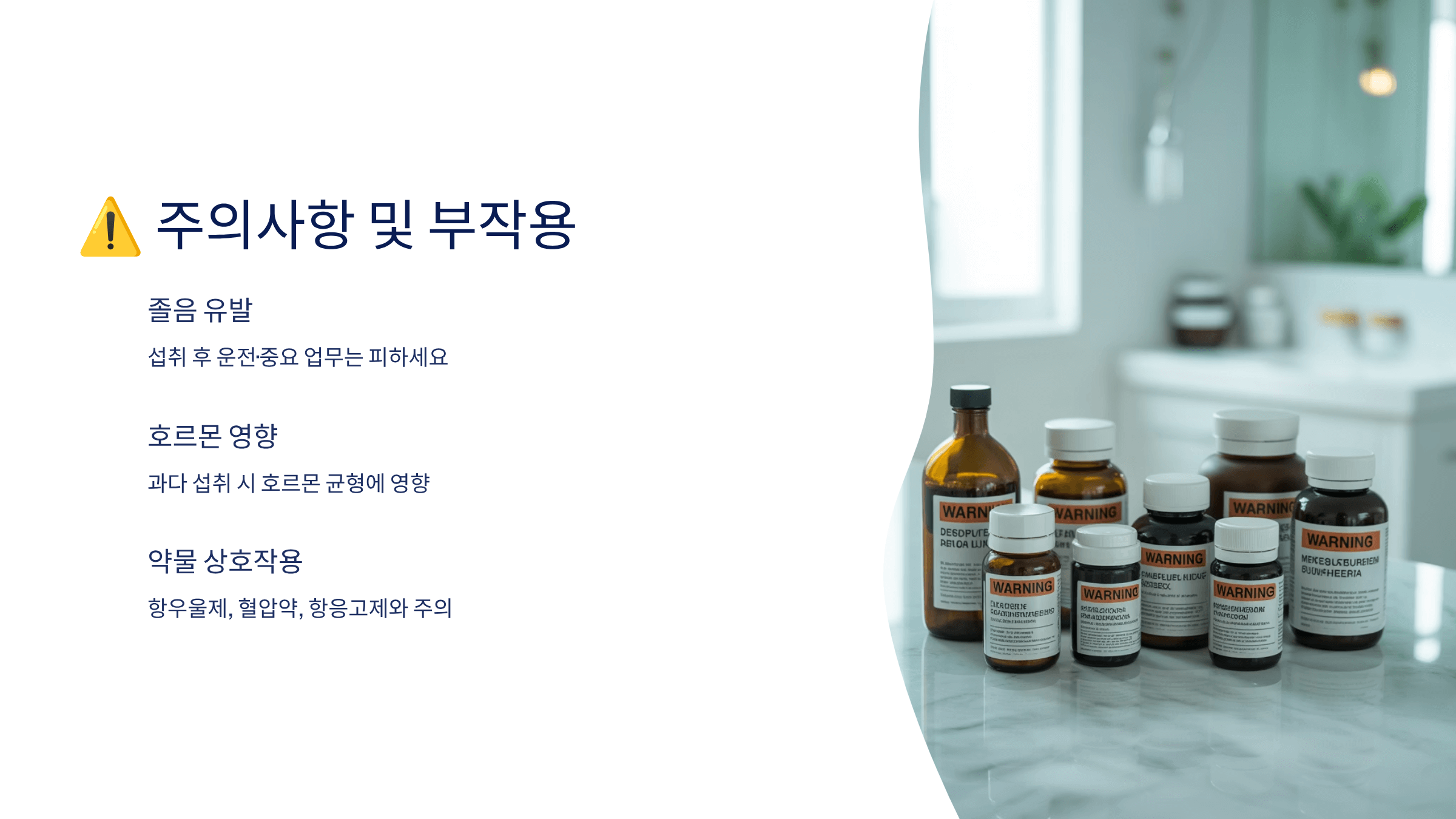 섭취 후 운전·중요 업무는 피하세요. - 호르몬 영향