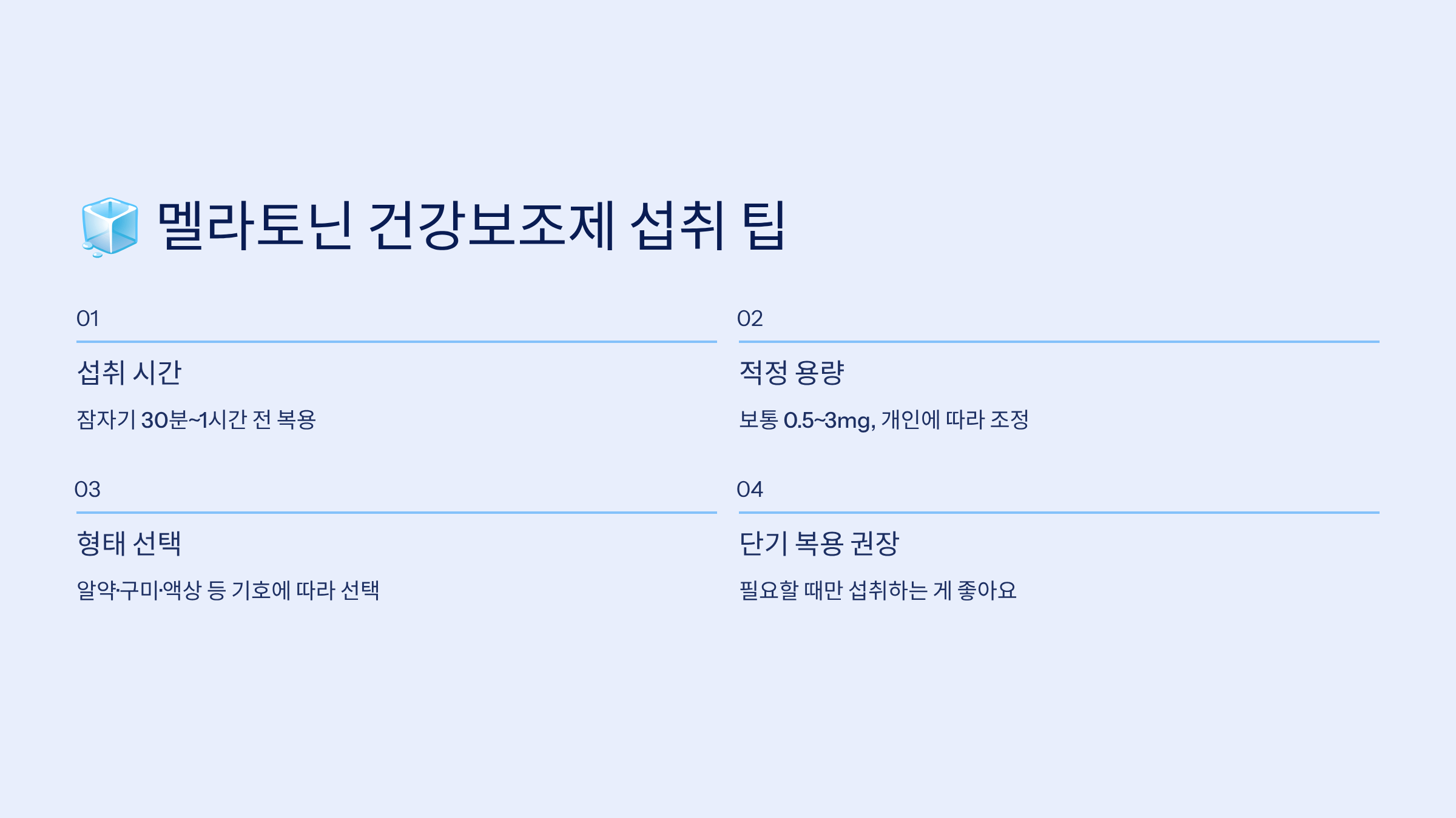 - 적정 용량: 보통 0.5~3mg, 개인에 따라 조정 필요