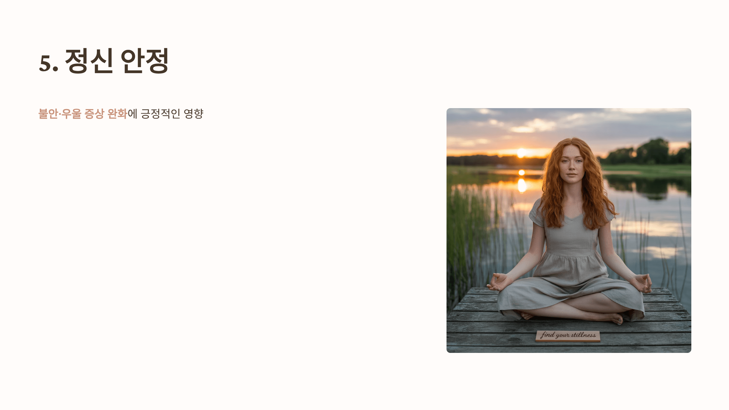 불안감과 스트레스 호르몬을 낮춰 우울감 개선에 도움을 줄 수 있습니다.