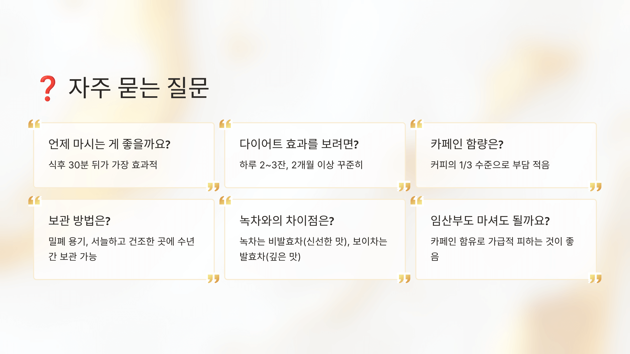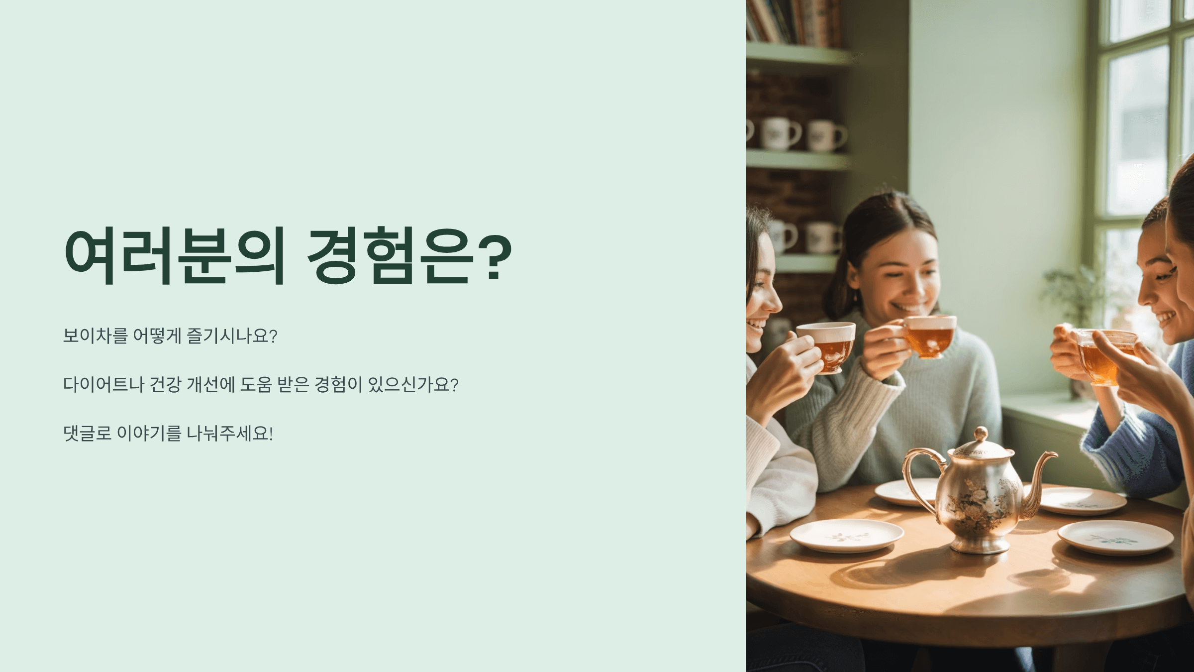 여러분은 보이차를 어떤 방식으로 즐기시나요? 혹시 다이어트나 건강 개선에 도움을 받으신 경험이 있으신가요? 댓글로 이야기를 나눠주시면 다른 분들께도 큰 도움이 될 것 같아요!