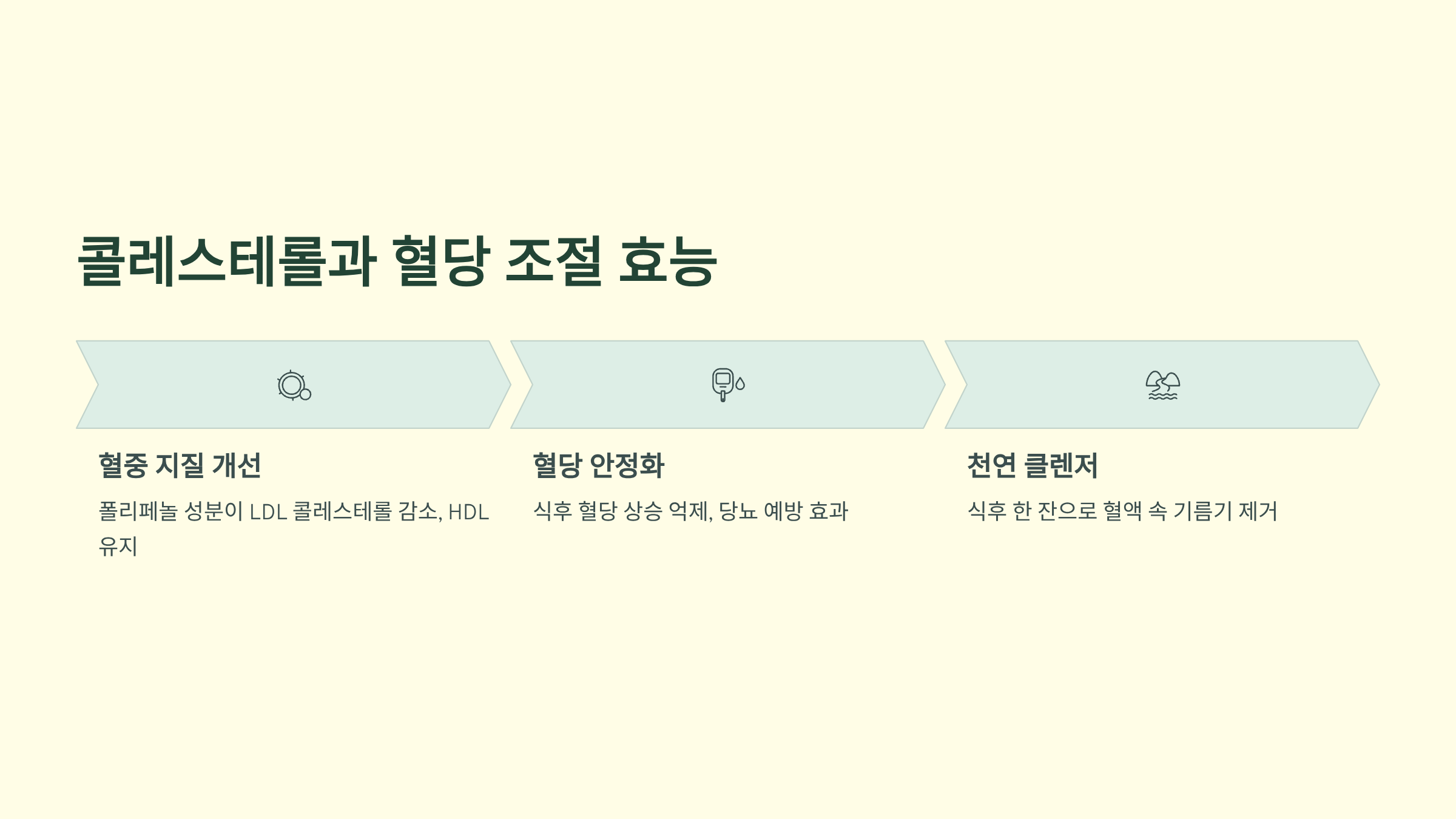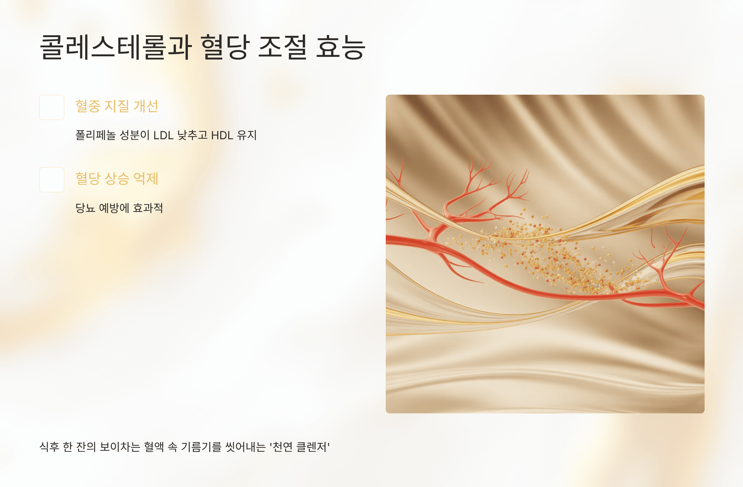 보이차의 대표적인 연구 성과 중 하나는 혈중 지질 개선 효과입니다. 보이차에 포함된 폴리페놀 성분이 나쁜 콜레스테롤(LDL)을 낮추고, 좋은 콜레스테롤(HDL)은 유지하는 데 도움을 줍니다.