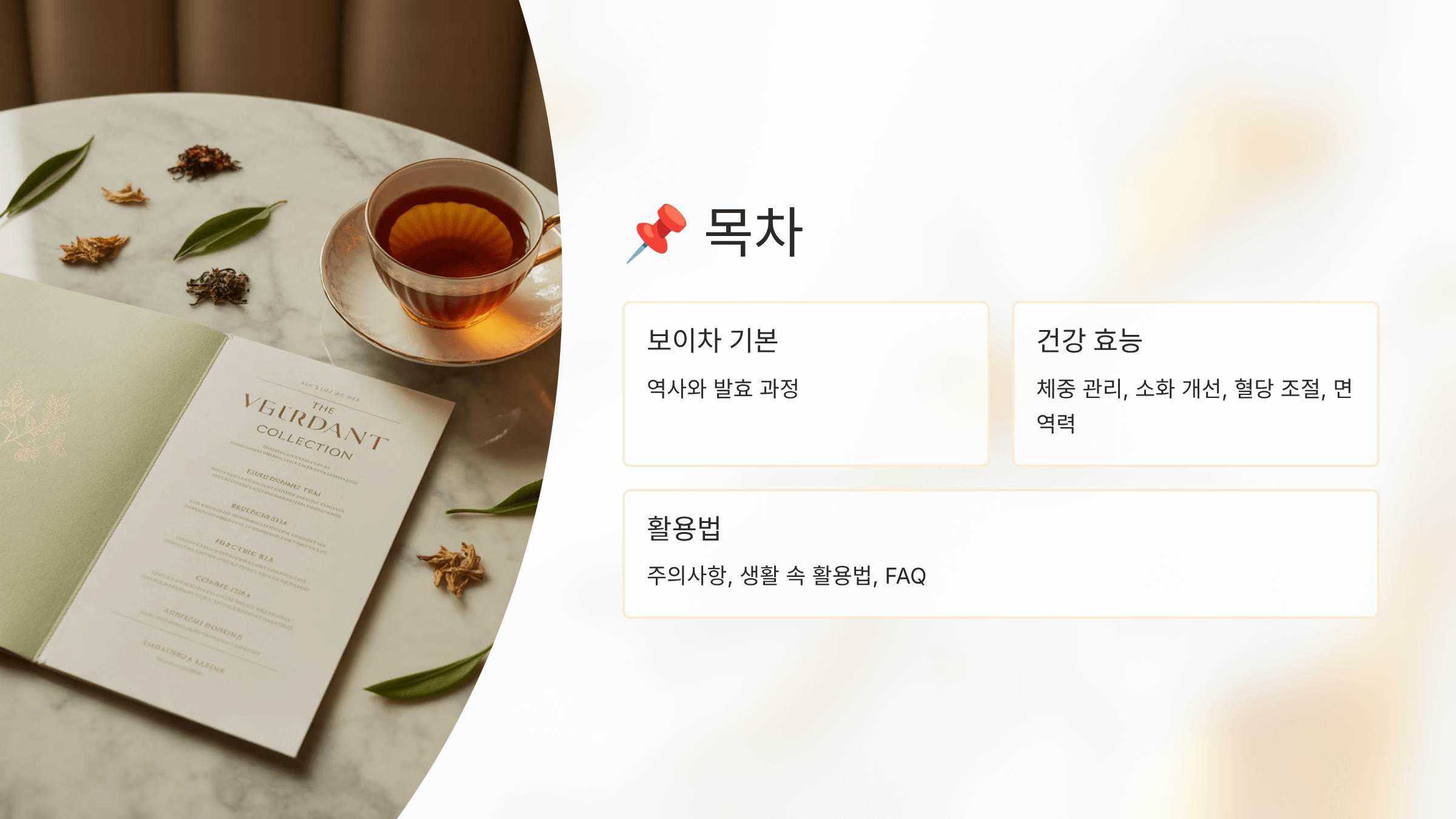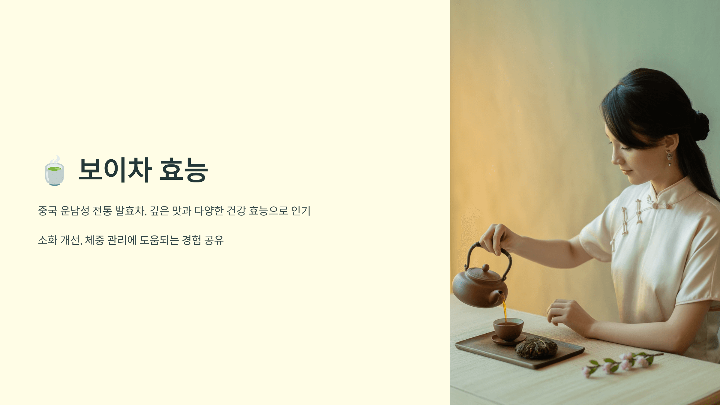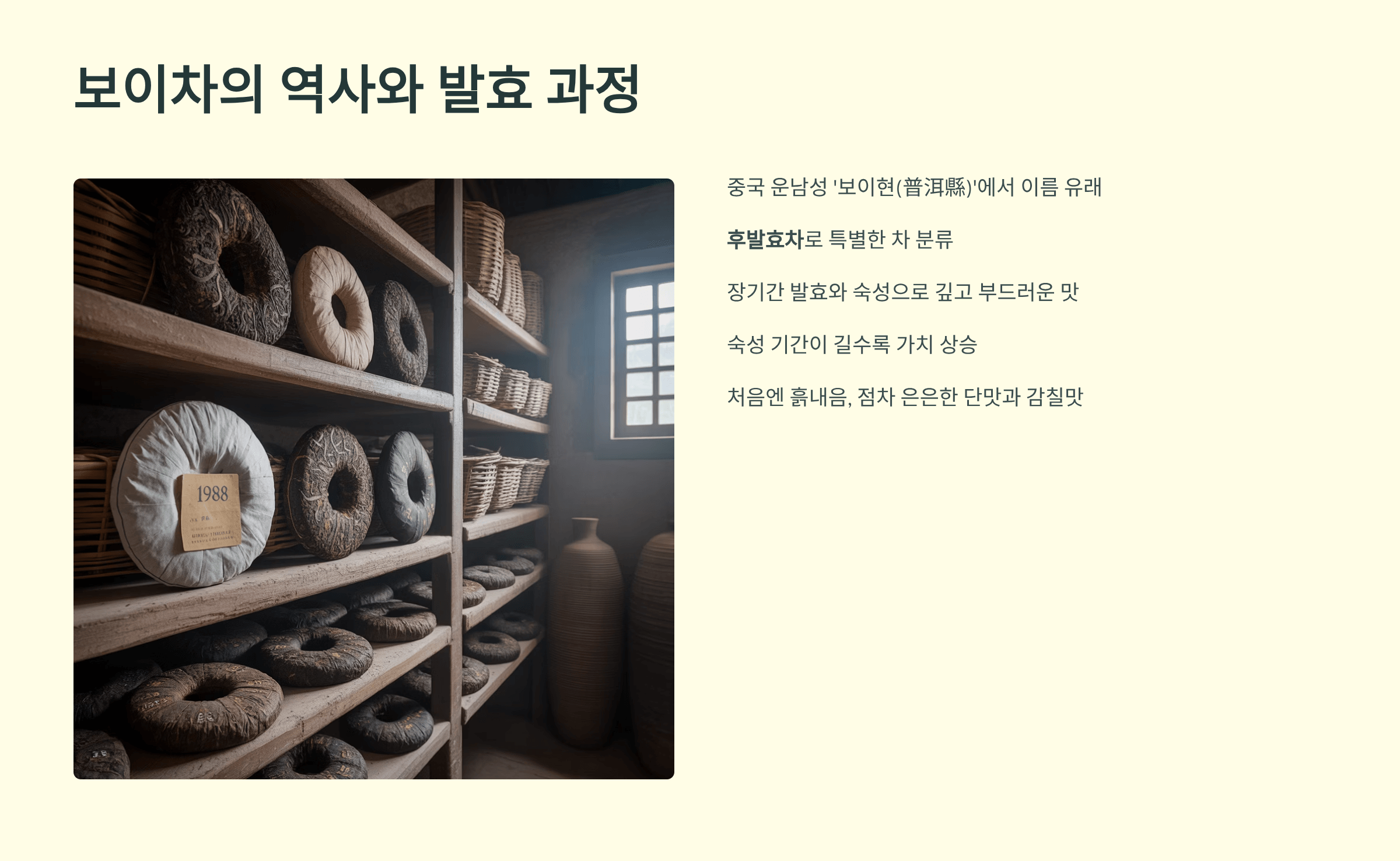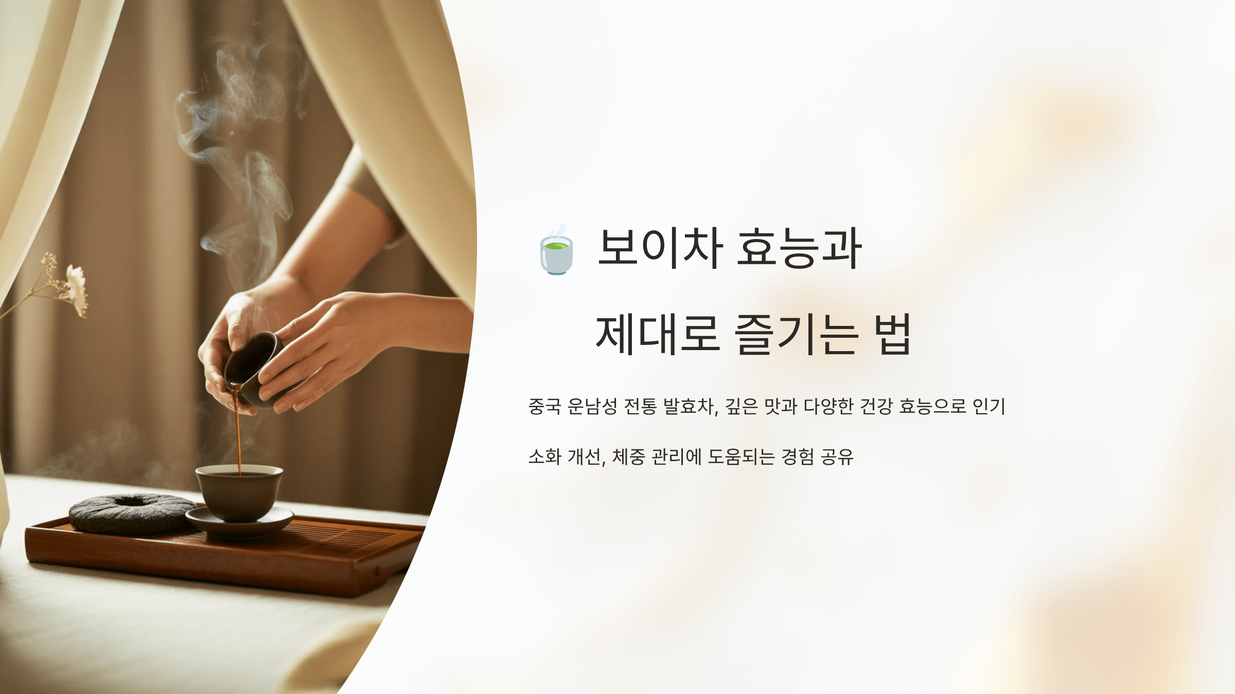 보이차는 중국 운남성에서 유래한 전통 발효차로, 깊은 맛과 함께 다양한 건강 효능으로 세계적으로 인기를 끌고 있습니다. 저 역시 커피를 줄이고 보이차를 꾸준히 마시면서 몸의 변화를 체감했는데요. 소화가 편안해지고 체중 관리에도 도움이 되더라고요. 오늘은 보이차의 숨겨진 효능과 올바른 음용법까지, 직접 경험한 듯 생생하게 알려드릴게요!