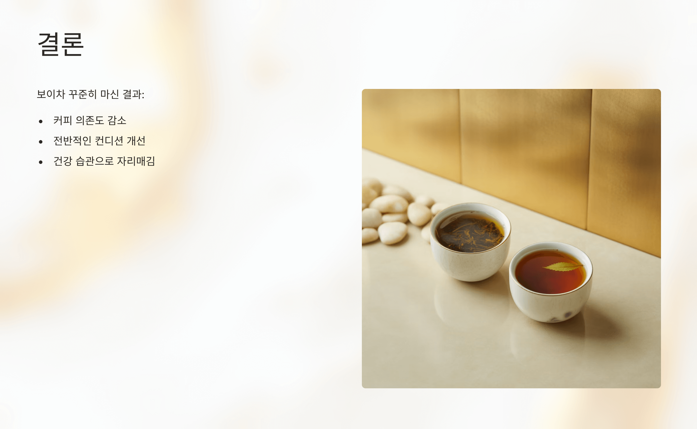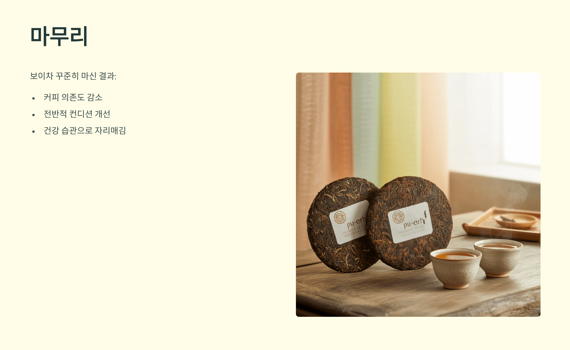 저는 보이차를 꾸준히 마신 덕분에 커피 의존도가 줄고, 몸의 컨디션이 한결 좋아졌습니다. 단순한 음료를 넘어 건강을 챙기는 습관이 된 셈이죠.