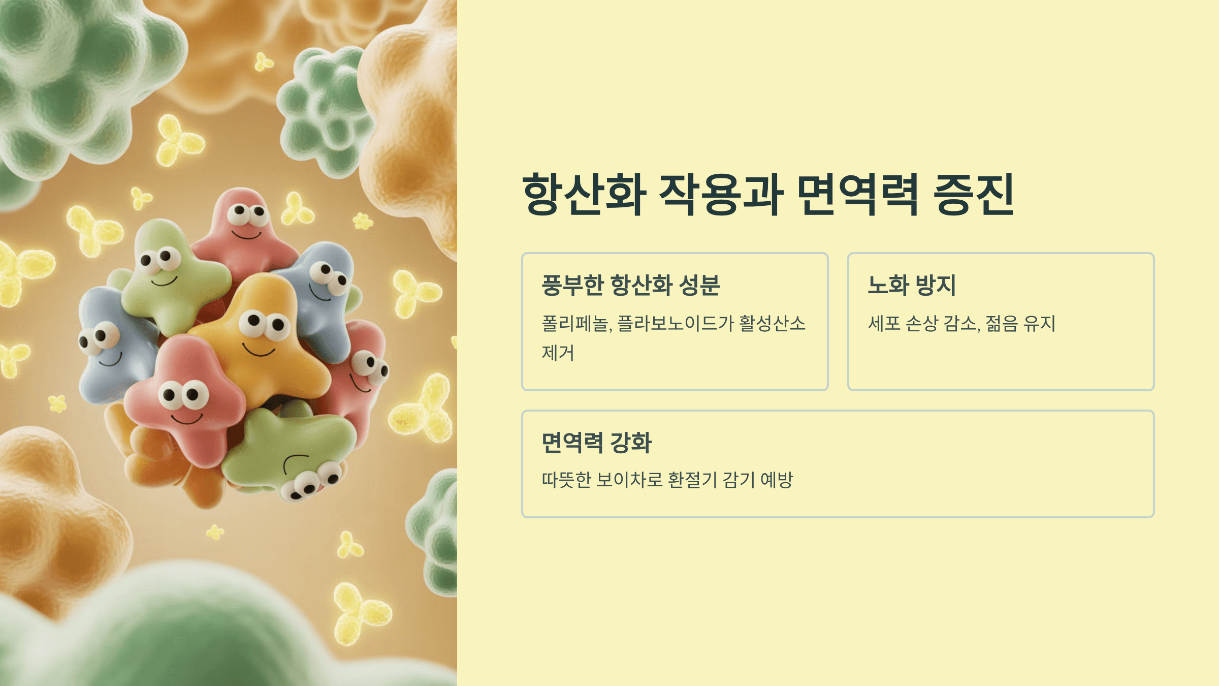 보이차에는 폴리페놀, 플라보노이드 같은 항산화 성분이 풍부합니다. 이 성분들은 활성산소를 제거해 노화를 늦추고 세포 손상을 줄여줍니다. 저는 환절기마다 피곤해서 쉽게 감기에 걸렸는데, 보이차를 꾸준히 마신 뒤로는 잔병치레가 눈에 띄게 줄었습니다.