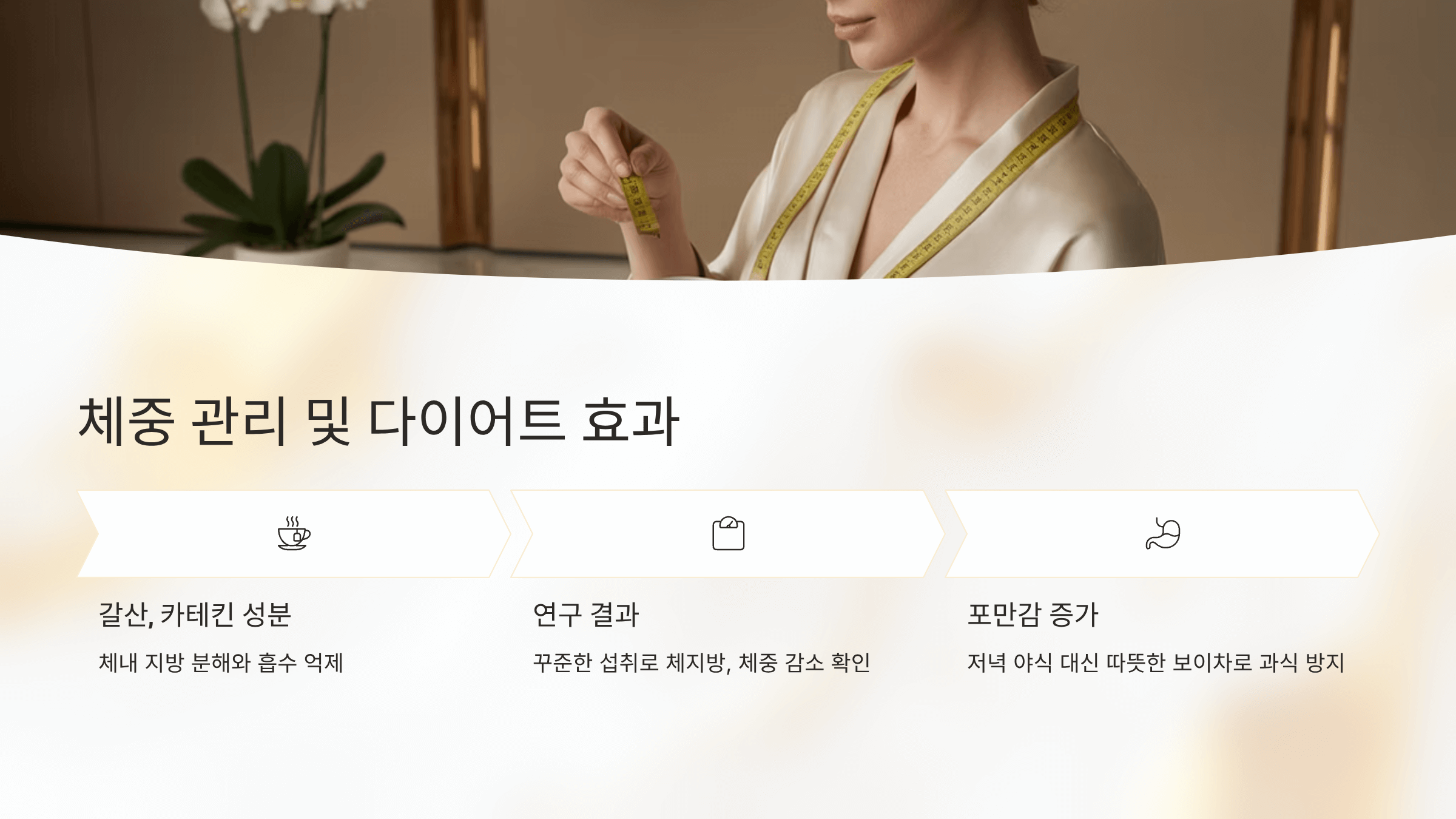 하루 2~3잔을 꾸준히 2개월 이상 마시면 체중 관리에 도움을 줍니다.