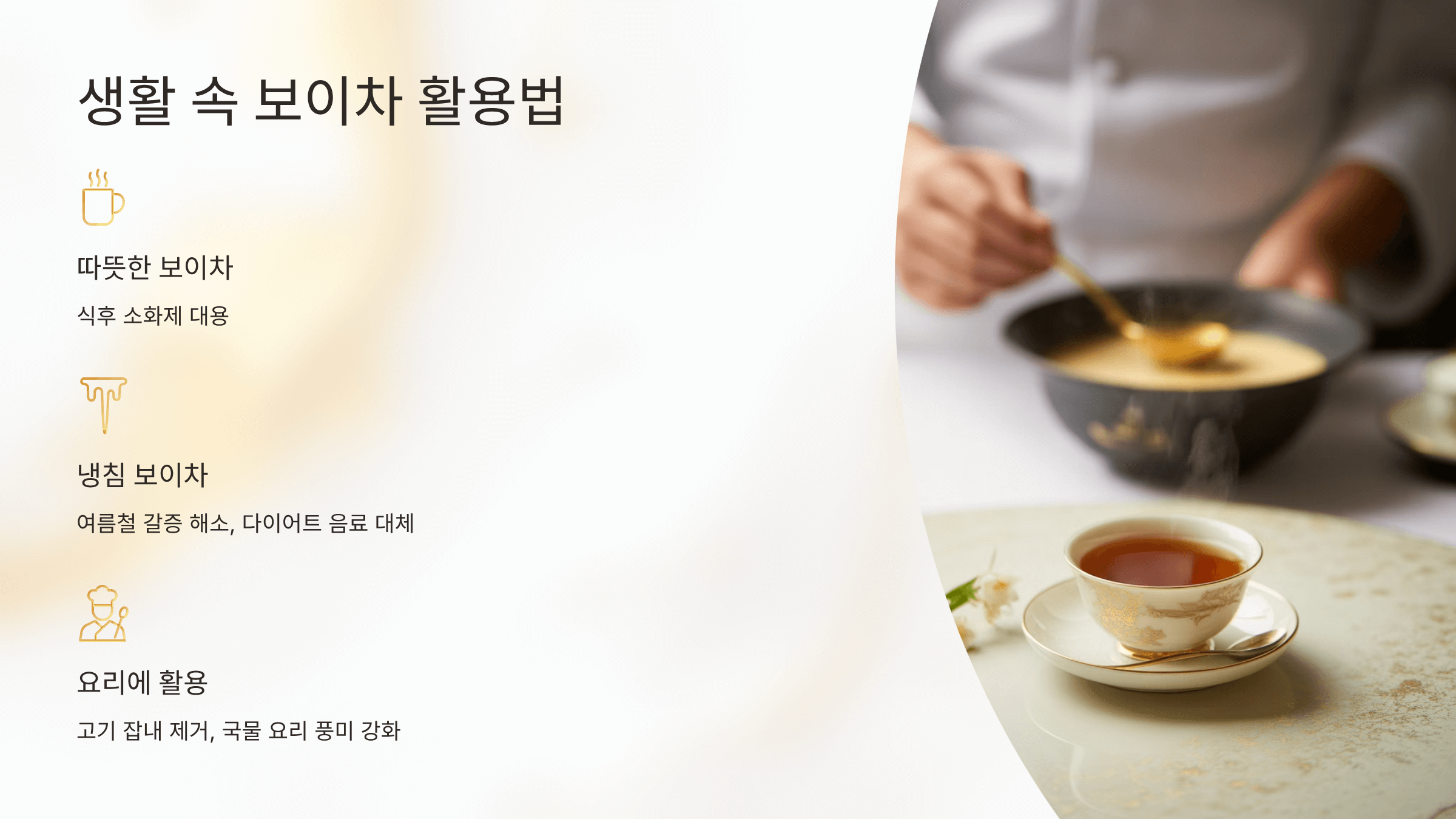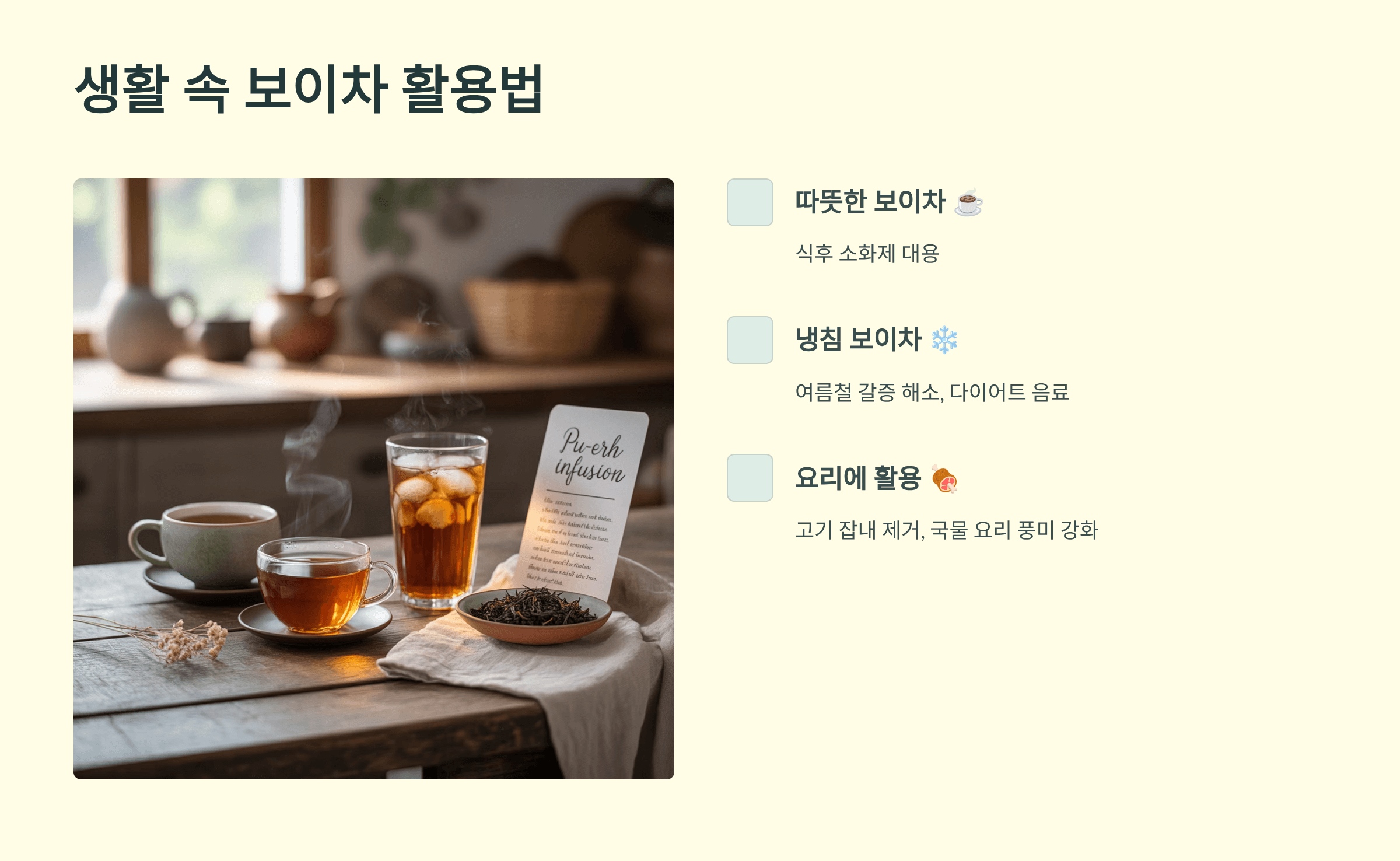 보이차는 단순히 차로 마시는 것 외에도 다양한 활용법이 있습니다.