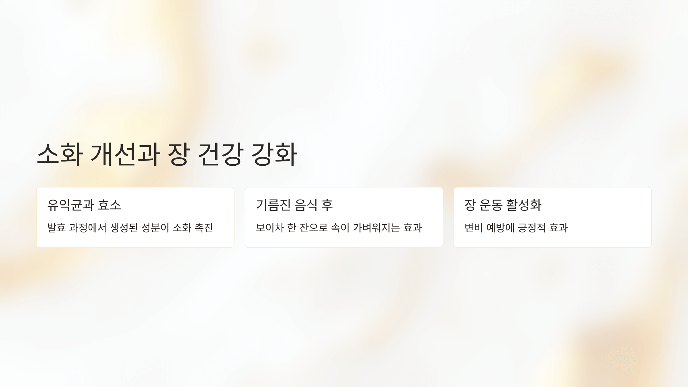 보이차에는 발효 과정에서 생성된 유익균과 효소가 많아 소화를 촉진하고 장내 환경을 개선하는 데 도움을 줍니다. 기름진 음식을 먹고 속이 답답할 때 보이차 한 잔을 마시면 한결 가벼워지는 걸 느낄 수 있습니다.