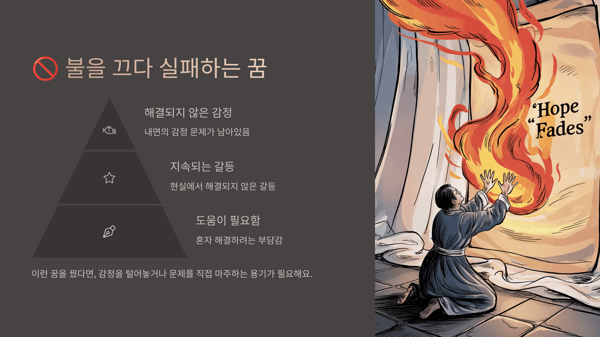 | 불을 못 끔 | 갈등 지속, 감정 억눌림 |
