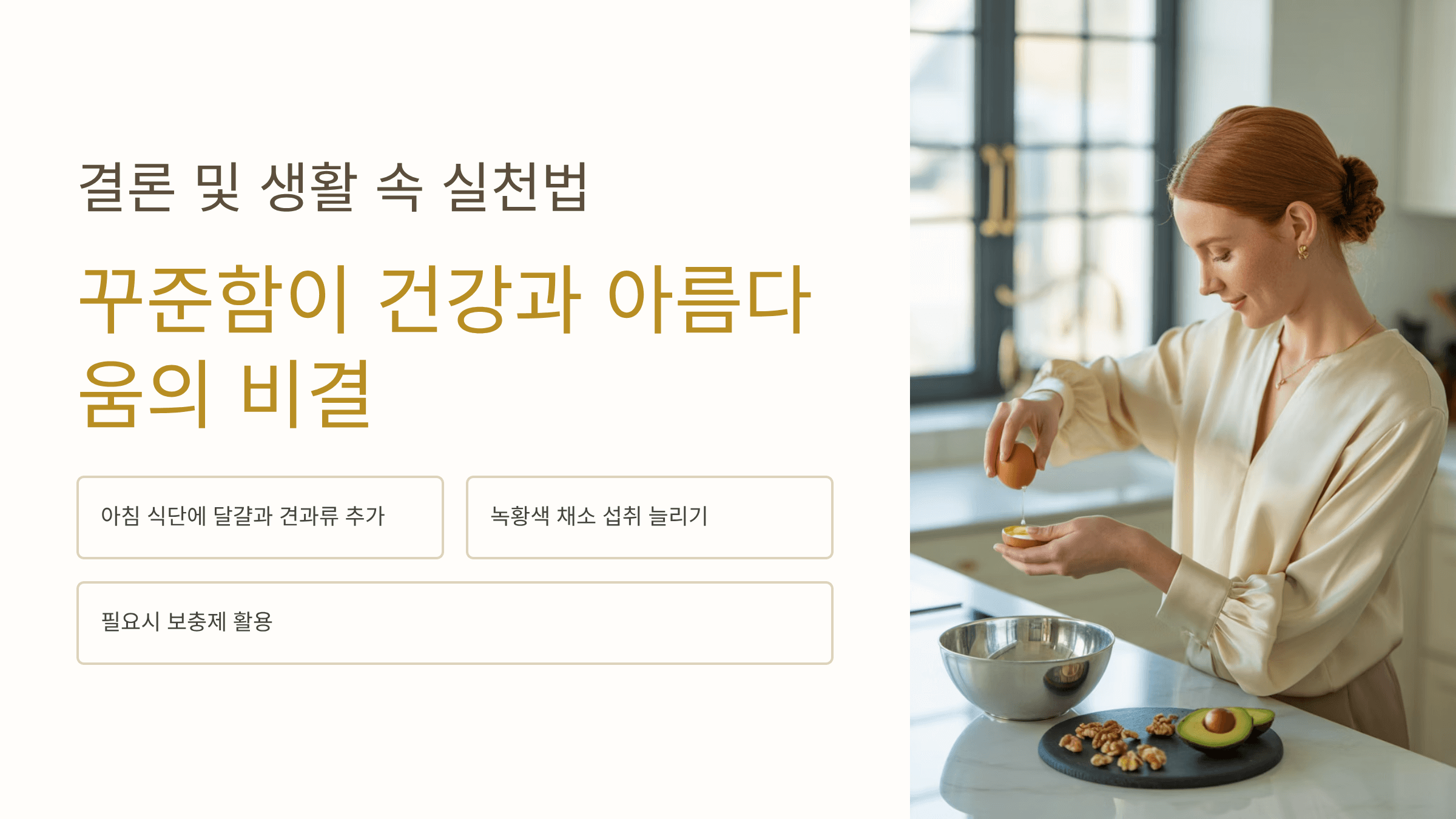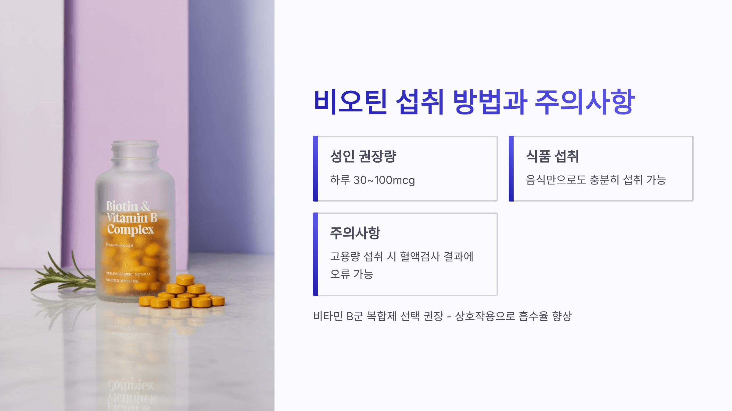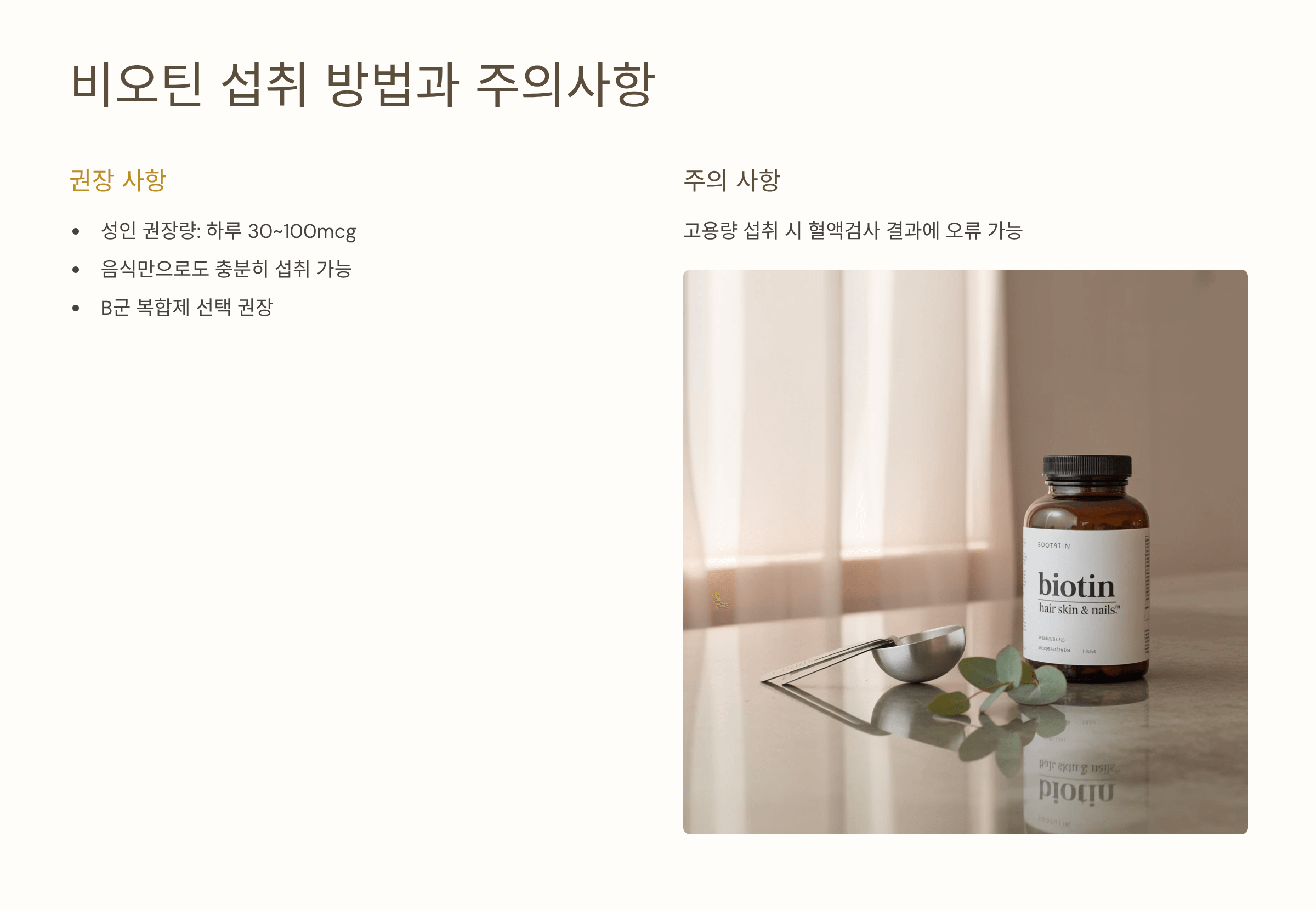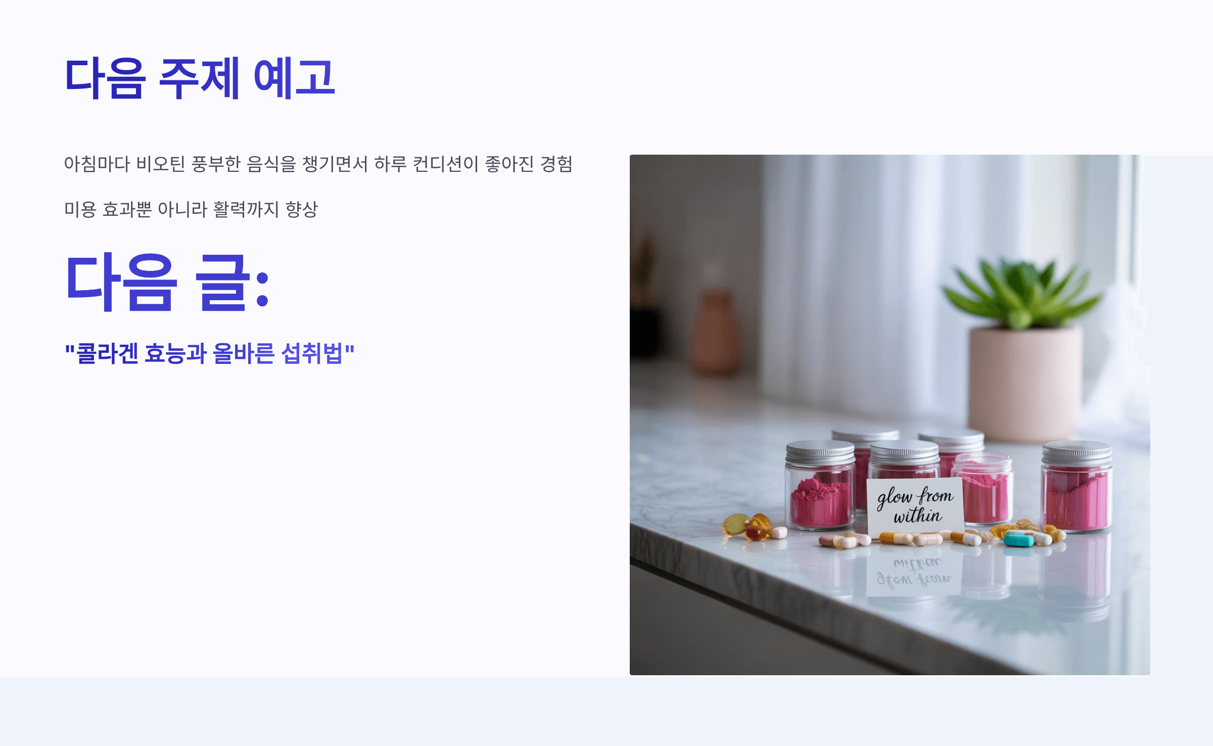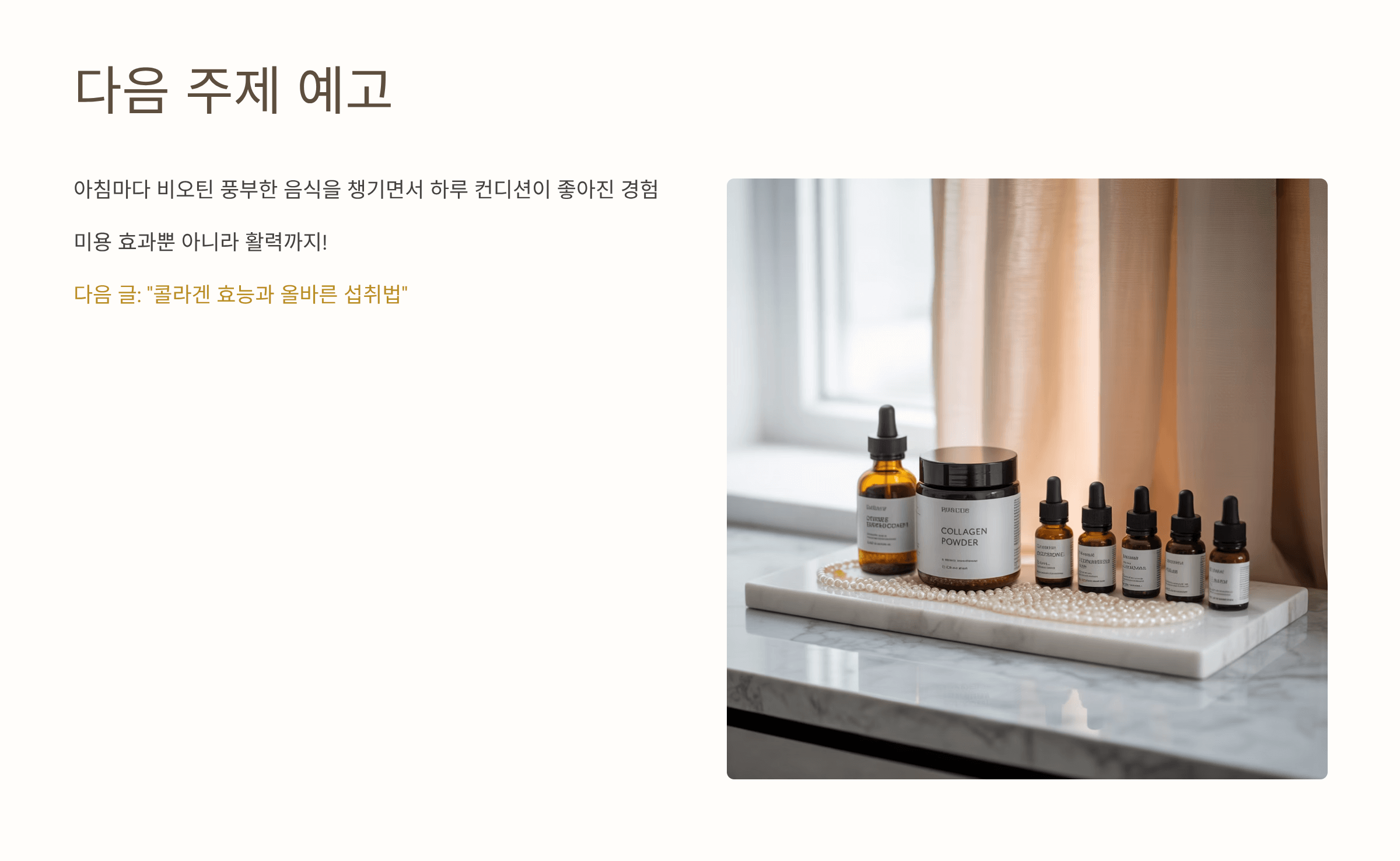 짧게 덧붙이자면, 저는 요즘 아침마다 비오틴 풍부한 음식을 챙기면서 하루 컨디션이 좋아진 걸 느낍니다. 단순히 미용 효과뿐 아니라 활력까지 준다는 게 놀라웠습니다.