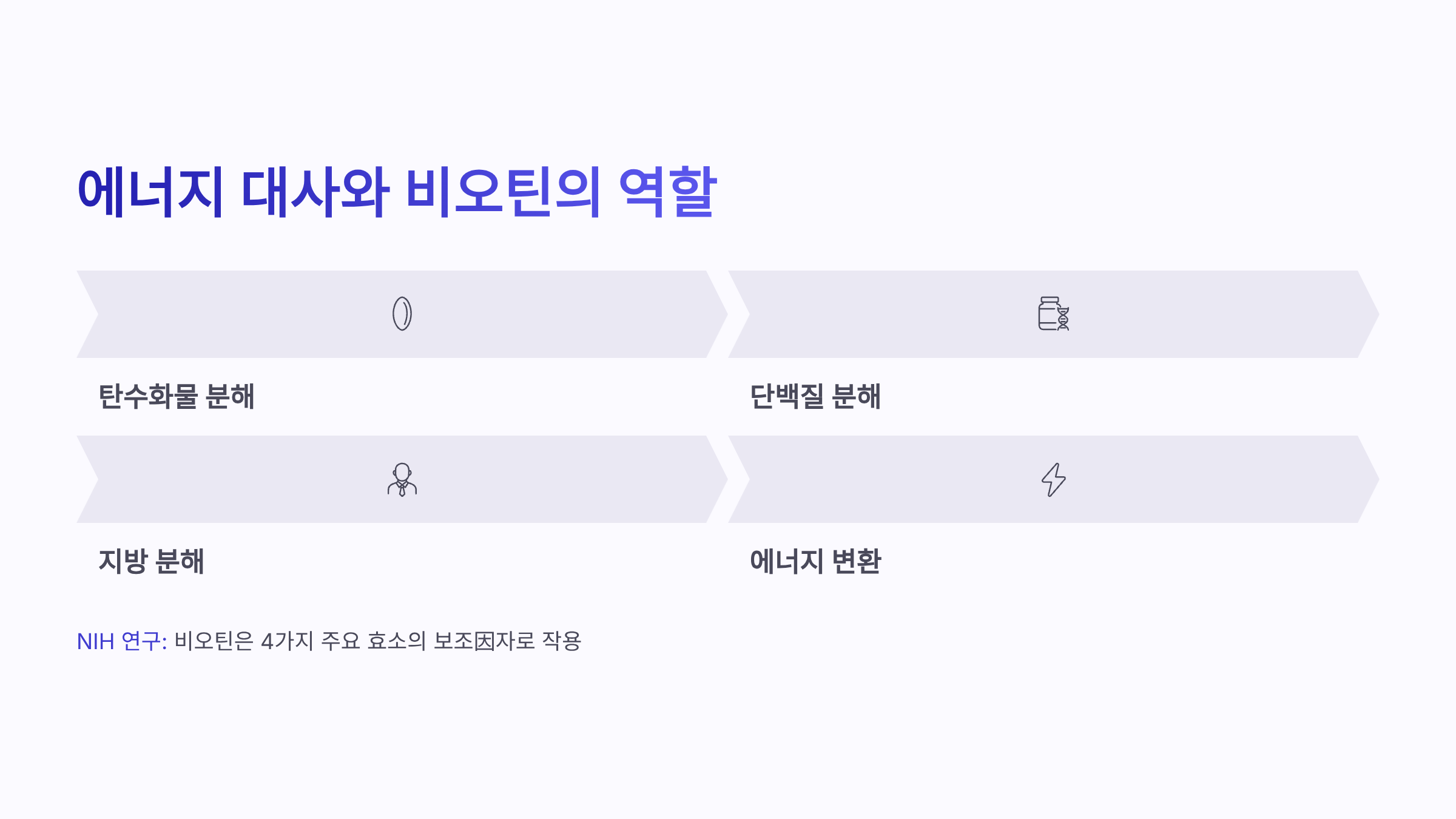 비오틴은 탄수화물, 단백질, 지방을 분해하고 에너지로 바꾸는 과정에 관여합니다. 쉽게 말해 우리가 먹은 음식이 제대로 활용되도록 도와주는 역할이지요. 만약 비오틴이 부족하다면 음식을 먹어도 쉽게 피로감을 느낄 수 있습니다. 실제로 미국 국립보건원(NIH)에 따르면 비오틴은 4가지 주요 효소의 보조因자로 작용해 포도당 생성, 지방산 합성, 아미노산 대사 등 생명 유지에 꼭 필요한 반응을 가능하게 한다고 밝혔습니다.