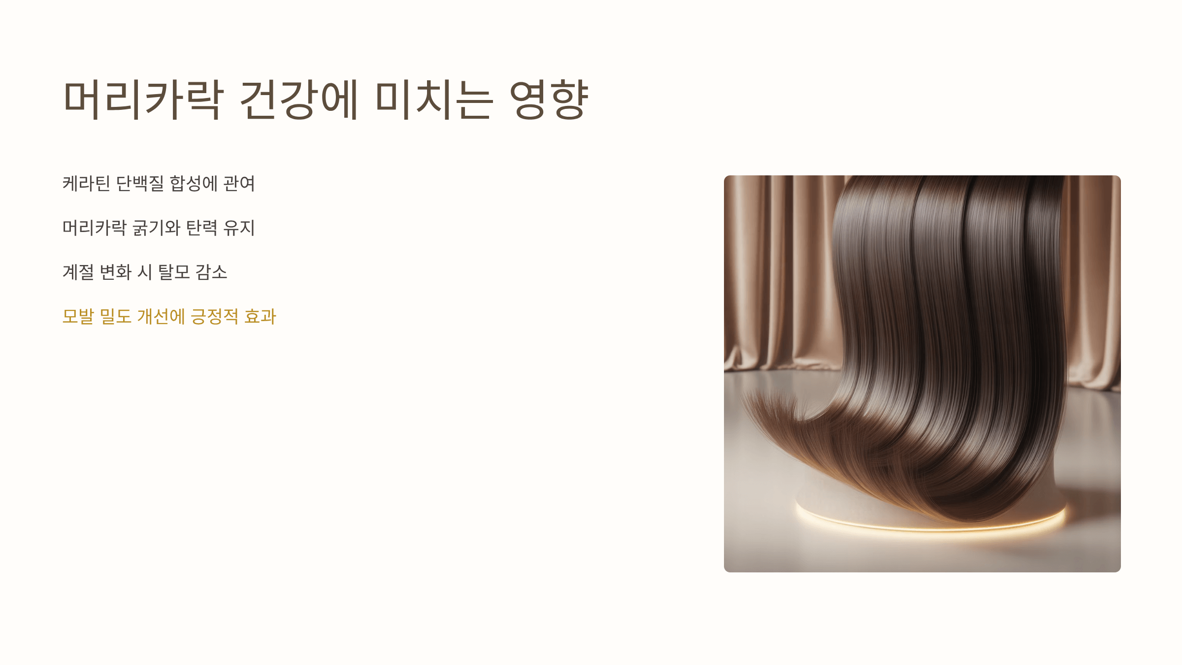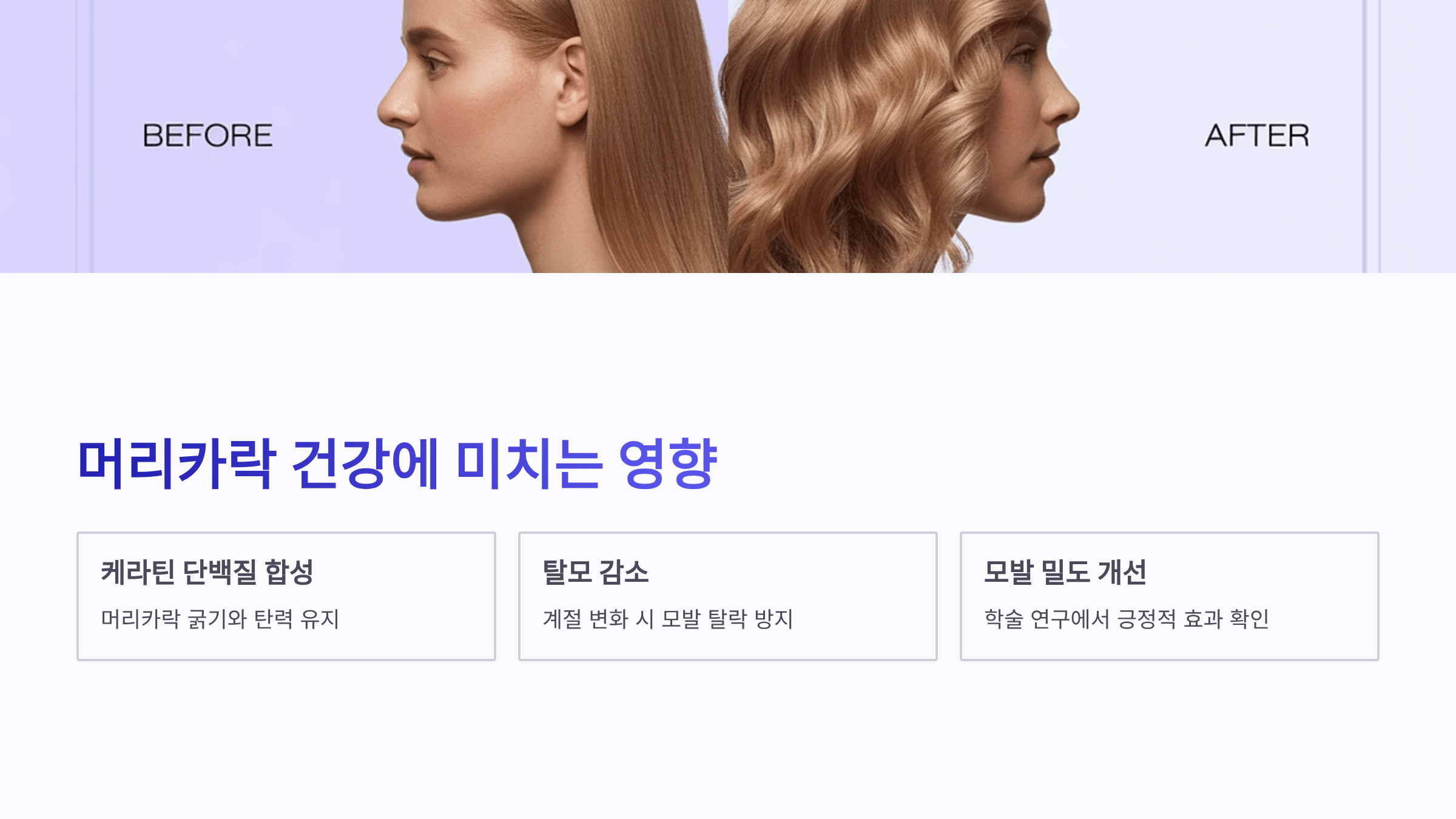 비오틴은 케라틴 단백질 합성에 관여하기 때문에 머리카락의 굵기와 탄력을 유지하는 데 도움을 줍니다. 제가 처음 비오틴을 섭취했을 때 가장 크게 체감한 건 머리카락 빠짐이 줄어들었다는 점이었어요. 특히 계절이 바뀔 때 머리가 많이 빠져 걱정했는데, 꾸준히 섭취하면서 확실히 모발이 튼튼해졌다는 걸 느꼈습니다. 학술 연구에서도 비오틴 결핍 시 탈모 증상이 두드러지며, 보충제를 섭취할 경우 모발 밀도 개선에 긍정적인 효과가 있다는 보고가 있습니다.