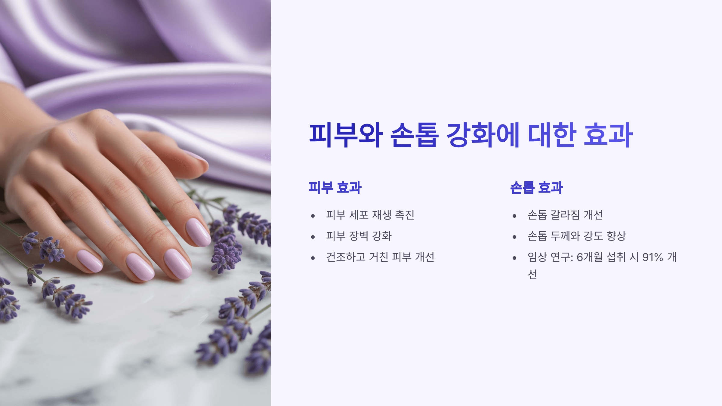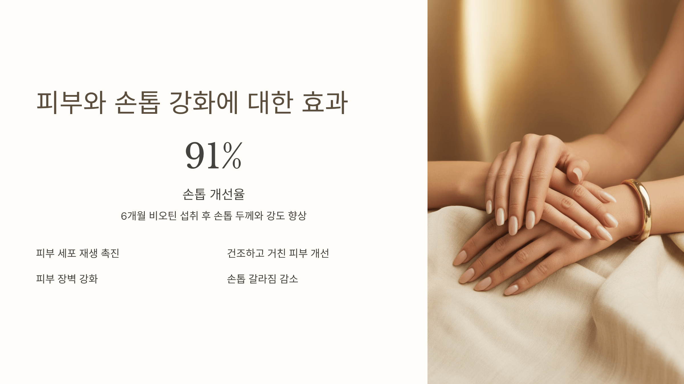 비오틴은 피부 세포의 재생을 도와 피부 장벽을 강화합니다. 건조하거나 거칠어진 피부에 도움을 줄 수 있으며, 손톱 갈라짐 개선에도 효과적입니다. 저 역시 사무실에서 자판기를 자주 두드리다 보니 손톱이 잘 깨져 불편했는데, 비오틴을 섭취하고 난 후에는 확실히 단단해졌습니다. 실제로 한 임상 연구에서는 손톱이 약한 참가자들이 비오틴 보충제를 6개월간 섭취했을 때, 91%에서 손톱 두께와 강도가 개선된 것으로 나타났습니다.