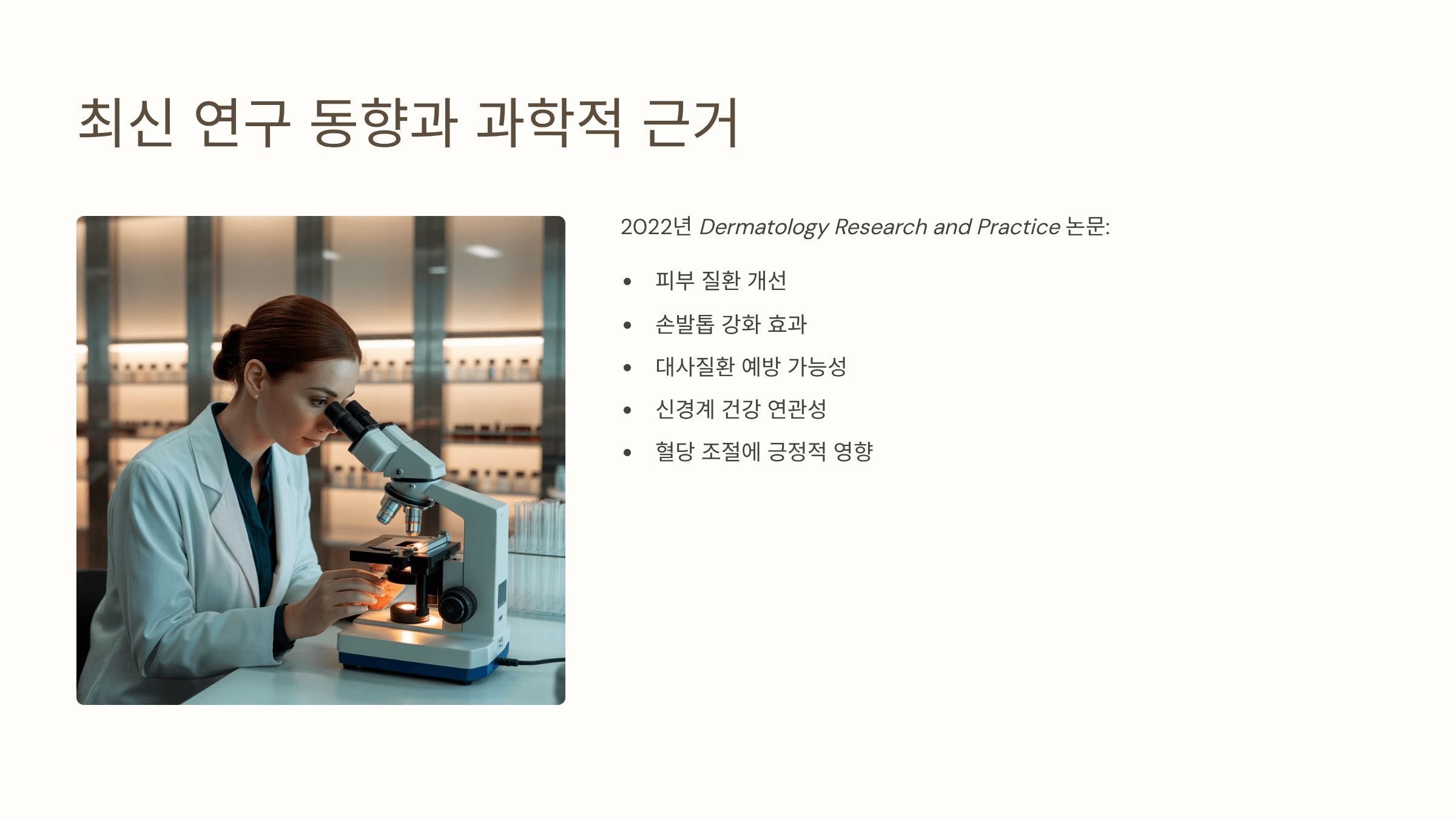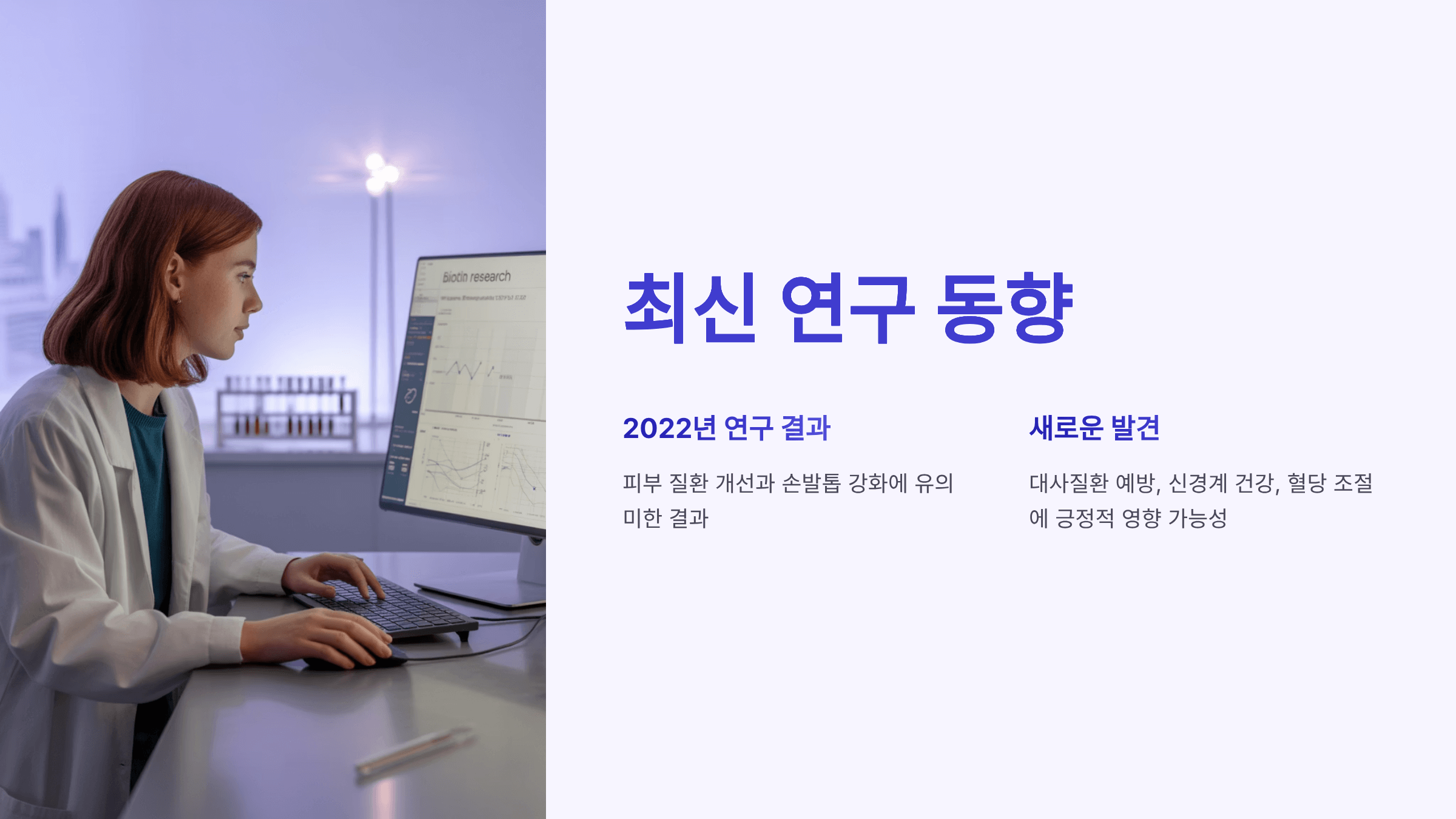 최근 학계에서는 비오틴의 효능에 대해 더 많은 연구가 이뤄지고 있습니다. 2022년 Dermatology Research and Practice에 발표된 논문에 따르면, 비오틴은 특정 피부 질환 개선과 손발톱 강화에 유의미한 결과를 보여주었으며, 대사질환 예방과 신경계 건강에도 연관이 있을 수 있다고 보고되었습니다. 또한 일부 연구에서는 비오틴이 혈당 조절에도 긍정적 영향을 줄 수 있다는 가능성이 제기되고 있습니다.