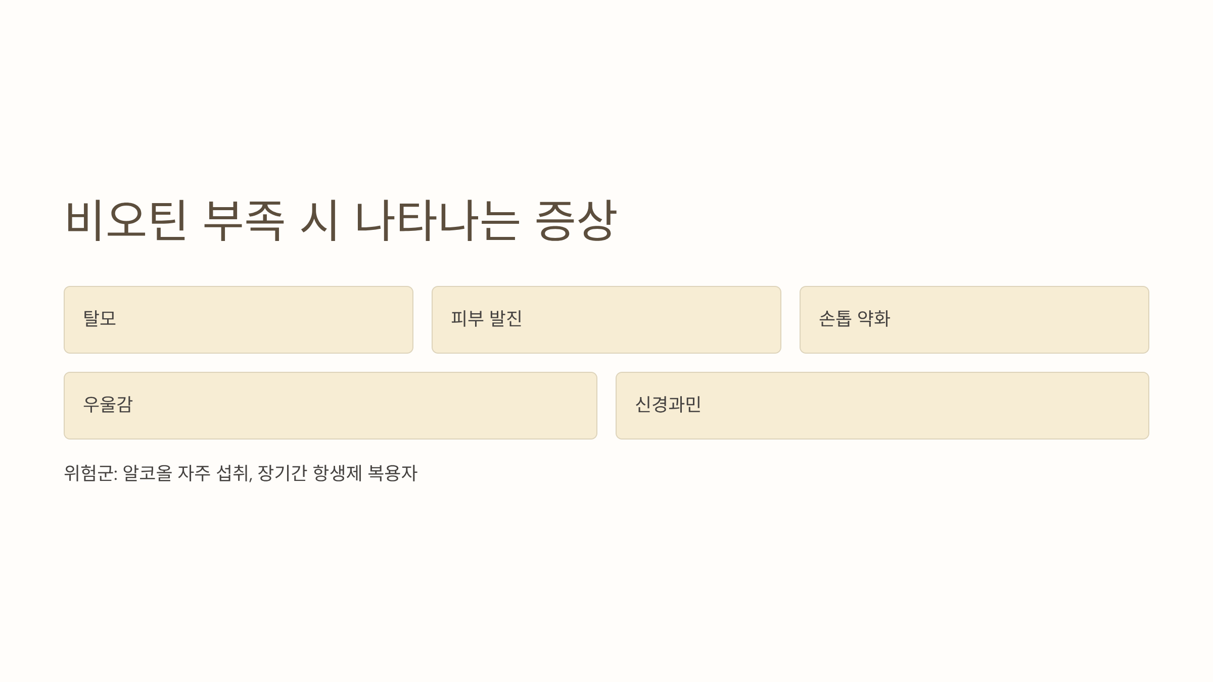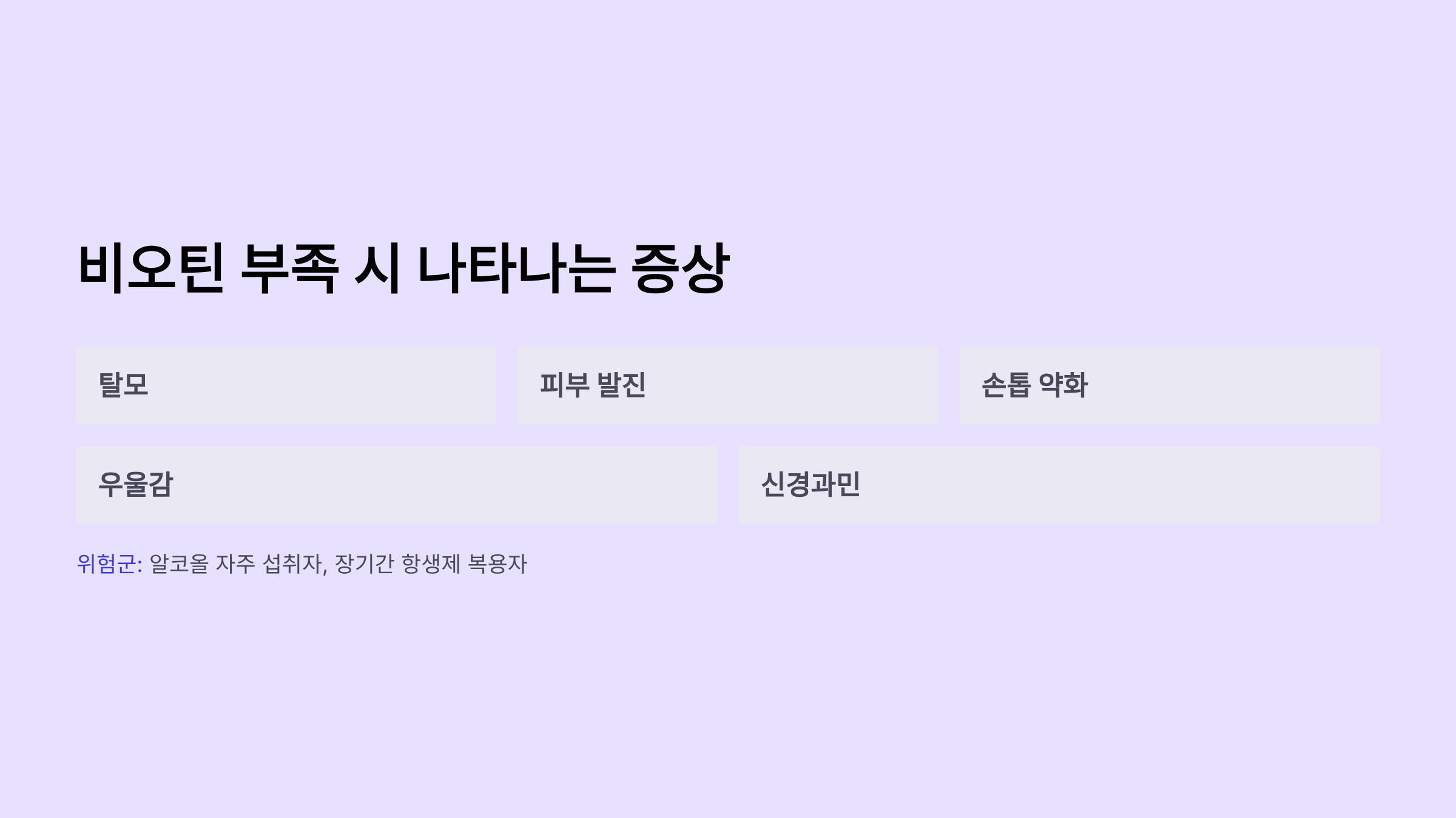 비오틴 부족은 드물지만, 특정 상황에서는 나타날 수 있습니다. 대표적인 증상은 탈모, 피부 발진, 손톱 약화, 우울감, 신경과민 등입니다. 특히 알코올을 자주 섭취하거나 장기간 항생제를 복용하는 사람은 결핍 위험이 큽니다. 실제로 저는 잦은 음주로 피부가 푸석해지고 손톱이 잘 부러진 적이 있었는데, 지금 생각하면 비오틴 부족도 한몫했을 거라는 생각이 듭니다.
