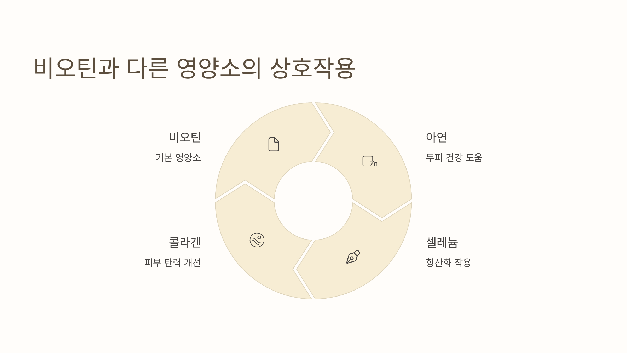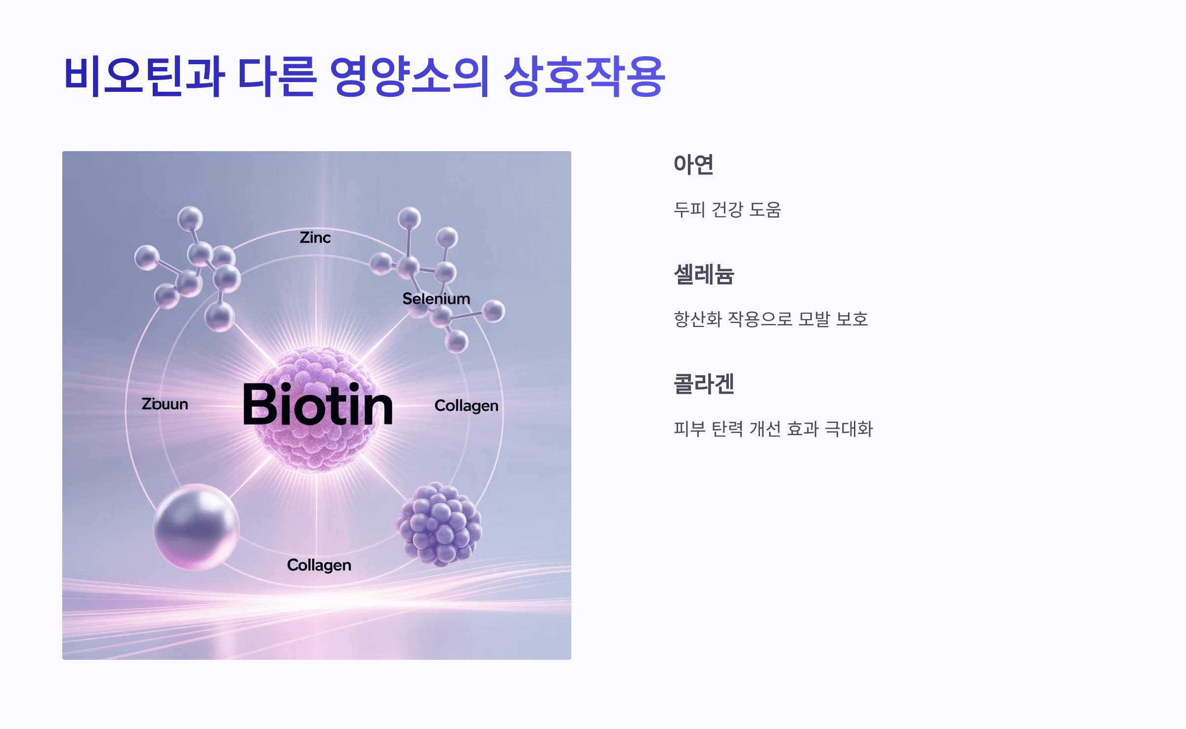 비오틴은 단독으로도 효과적이지만, 다른 영양소와 함께 섭취하면 시너지가 납니다. 예를 들어 아연은 두피 건강을 돕고, 셀레늄은 항산화 작용으로 모발을 보호합니다. 또한 콜라겐과 함께 섭취하면 피부 탄력 개선 효과를 극대화할 수 있습니다. 저도 비오틴과 콜라겐을 함께 챙기는데, 확실히 피부가 매끈해지고 머릿결도 한결 부드러워졌어요.