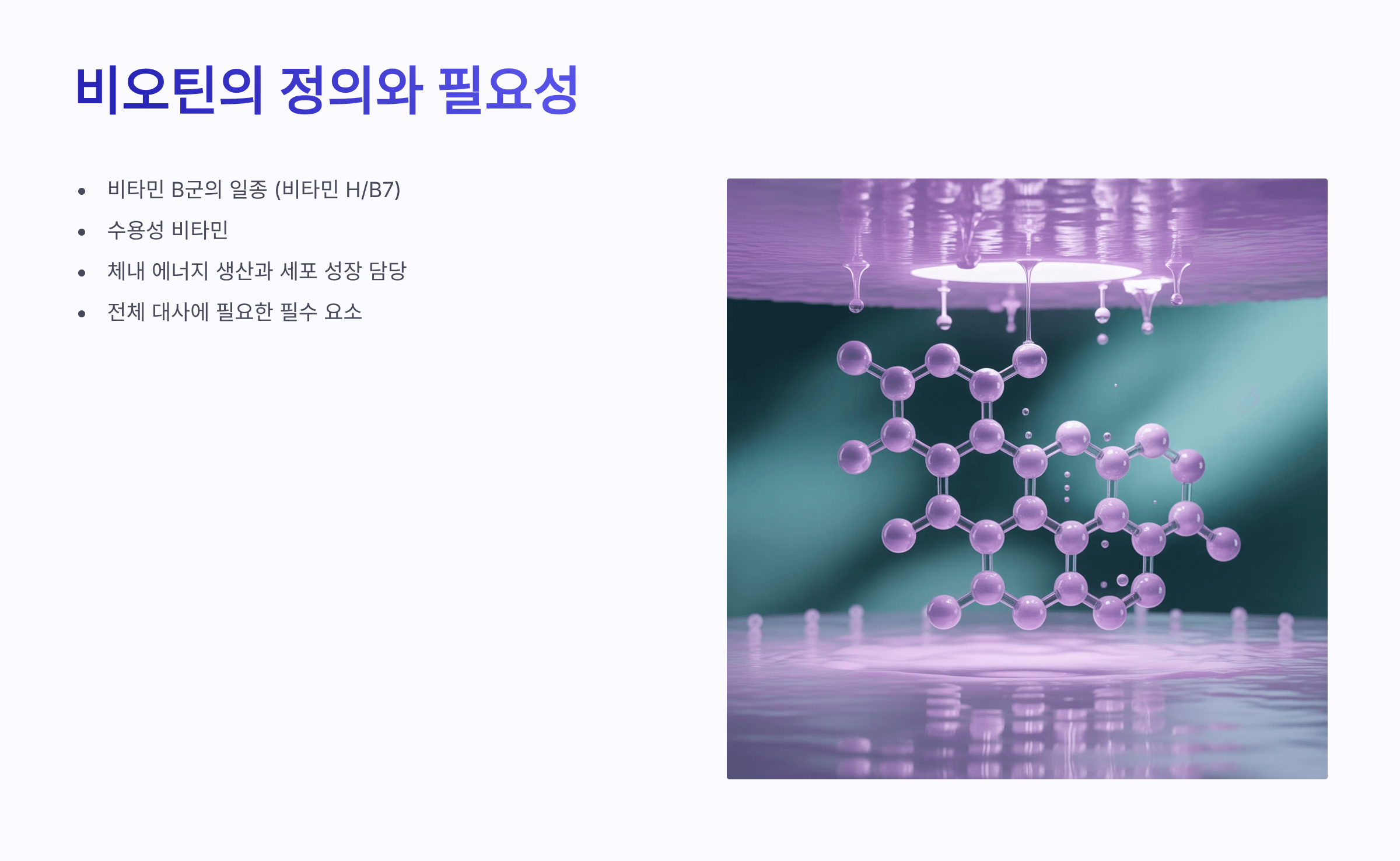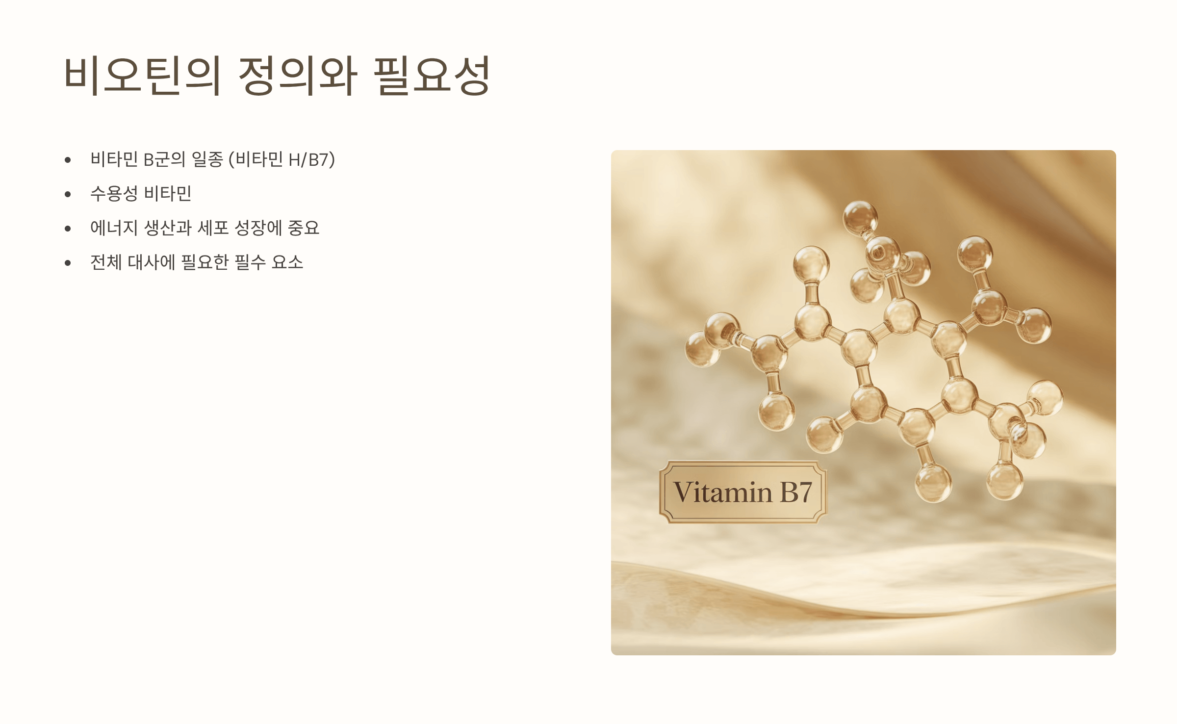 비오틴은 비타민 B군의 일종으로, 물에 잘 녹는 수용성 비타민입니다. ‘비타민 H’ 혹은 ‘비타민 B7’이라고 불리며, 체내 에너지 생산과 세포 성장에 중요한 역할을 담당합니다. 단순히 머리카락 건강을 위한 영양소로만 알려져 있지만 사실은 우리 몸 전체 대사에 필요한 필수 요소입니다. 저는 건강보조제를 잘 안 챙기는 편이었는데, 탈모와 손톱 갈라짐이 신경 쓰이던 시기에 비오틴을 알게 되었고, 섭취 후 확실한 변화를 경험했습니다.