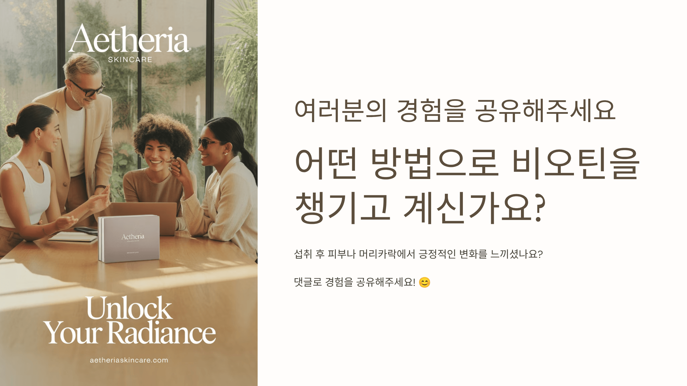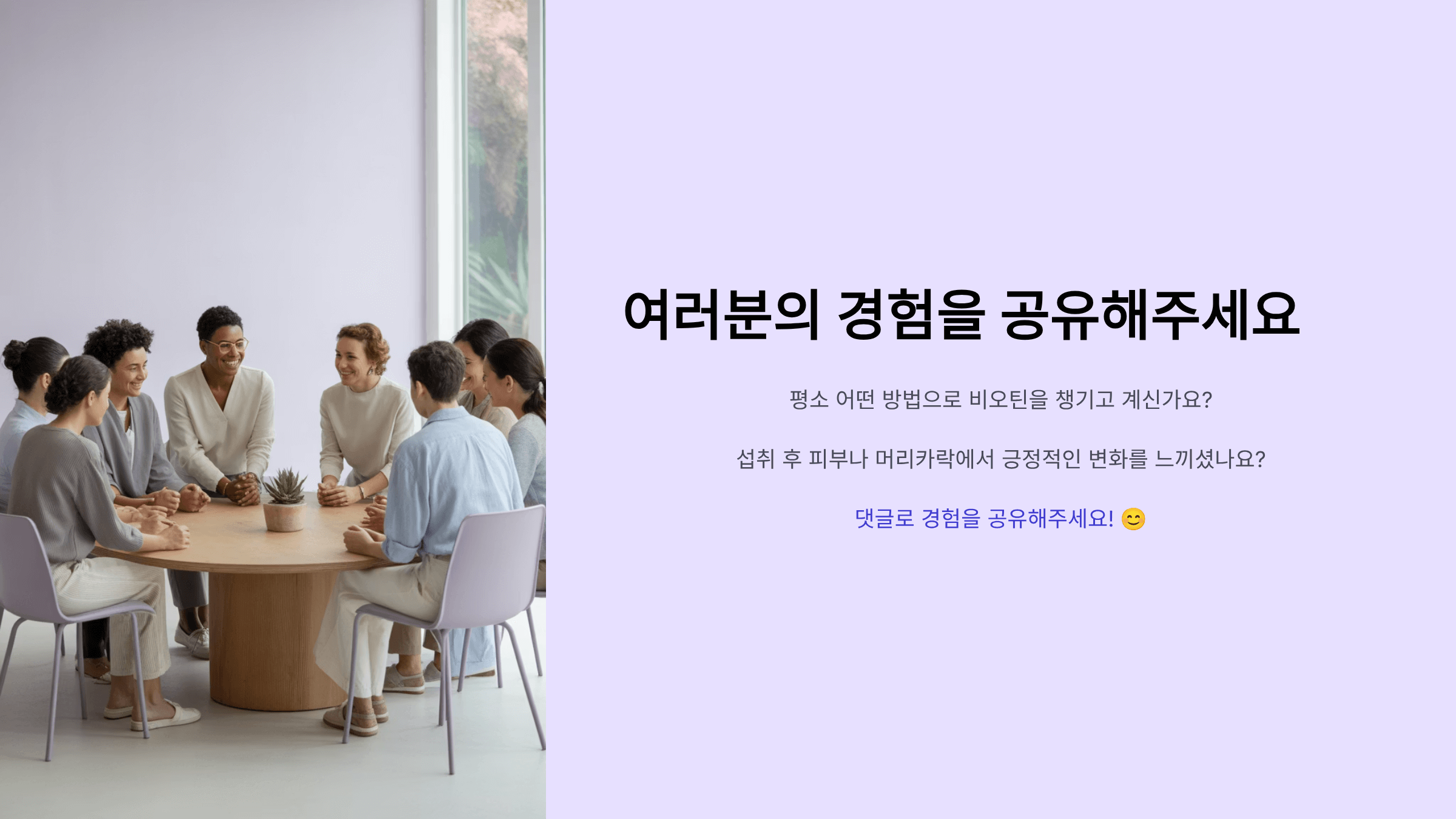여러분은 평소 어떤 방법으로 비오틴을 챙기고 계신가요? 혹시 섭취 후 피부나 머리카락에서 긍정적인 변화를 느끼신 적 있나요? 댓글로 경험을 공유해주시면 서로 도움이 될 것 같아요!