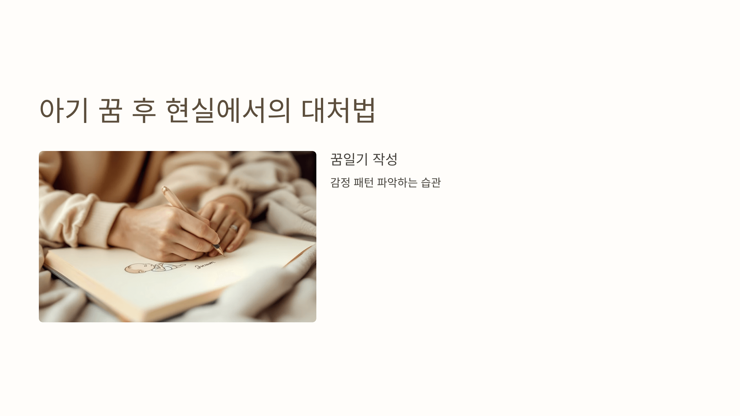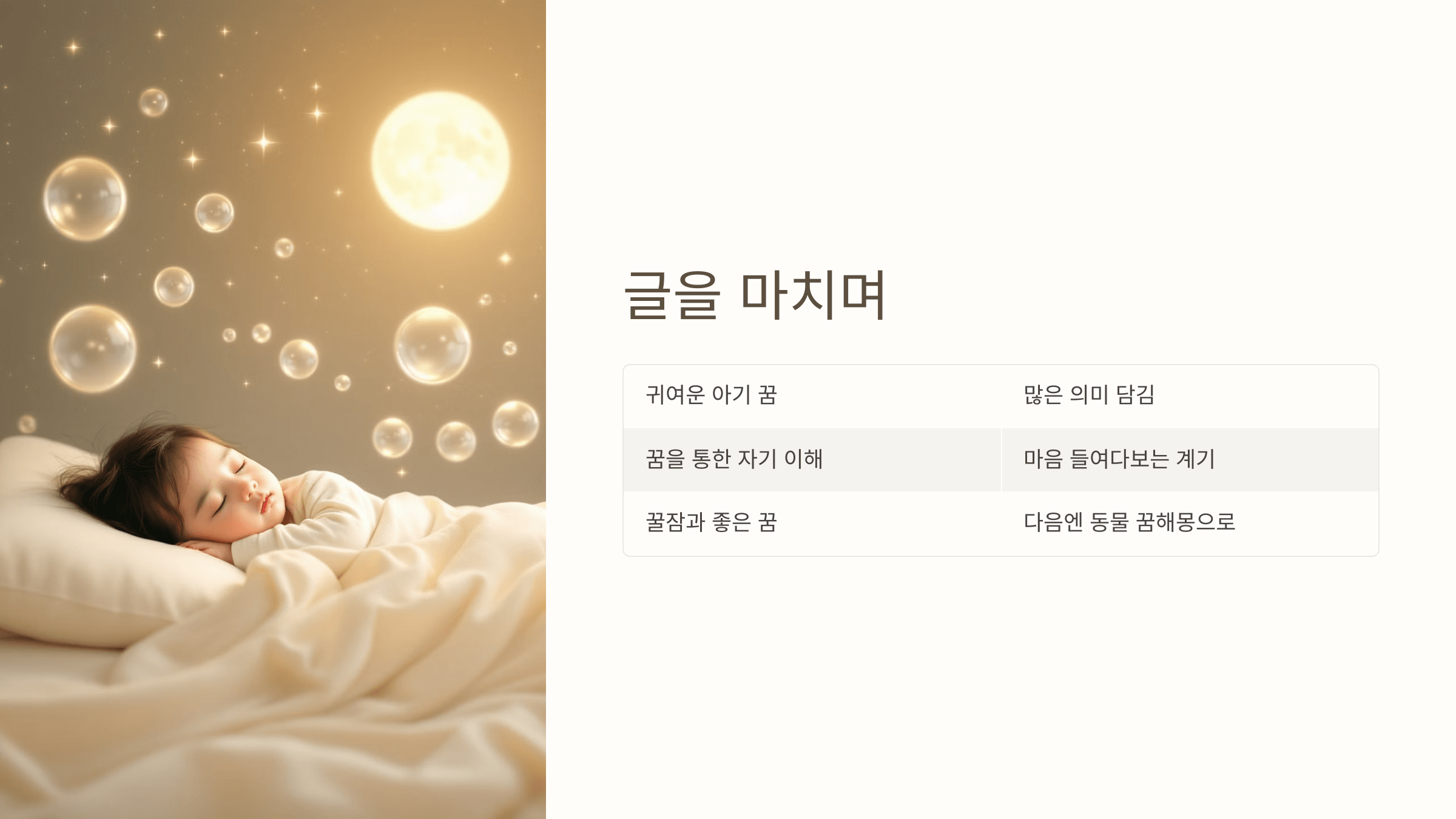 처음엔 그저 귀엽기만 했던 아기 꿈이 이렇게 많은 의미를 담고 있을 줄은 몰랐어요. 꿈을 통해 내 마음을 들여다보는 계기가 된다는 걸 알게 되면서, 꿈을 더 진지하게 받아들이게 되었답니다. 여러분도 오늘 밤 꿀잠 주무시고, 좋은 꿈 꾸시길 바랄게요🌙